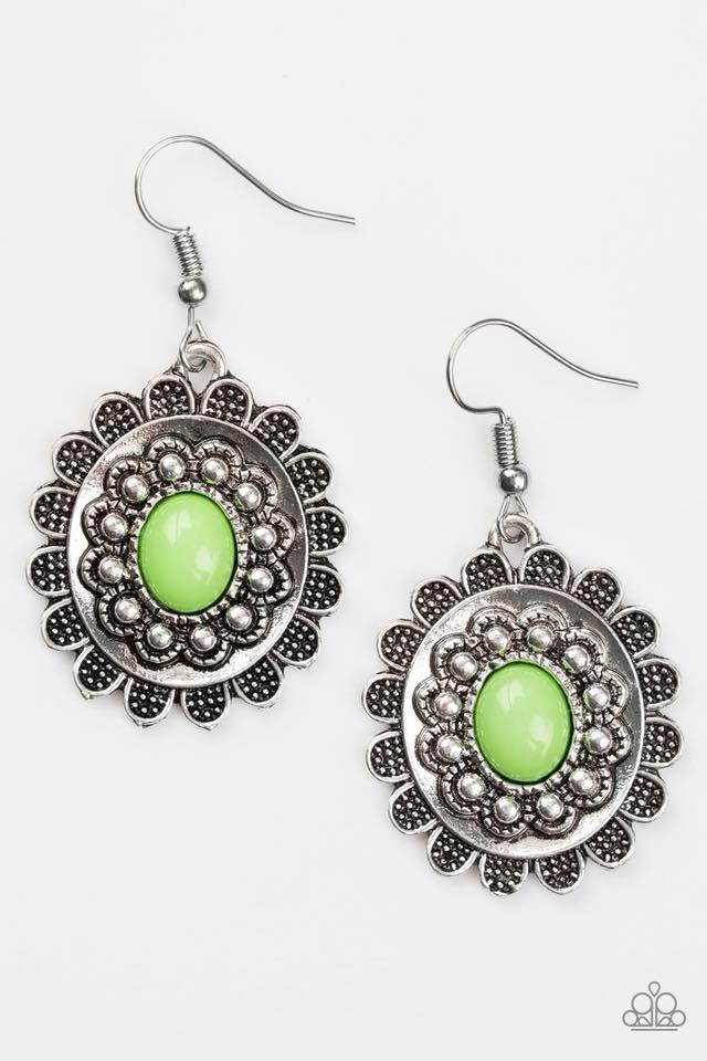 Una refrescante cuenta verde se coloca en el centro de un marco floral ornamentado para lograr un estilo veraniego. El pendiente se fija a un gancho estándar.