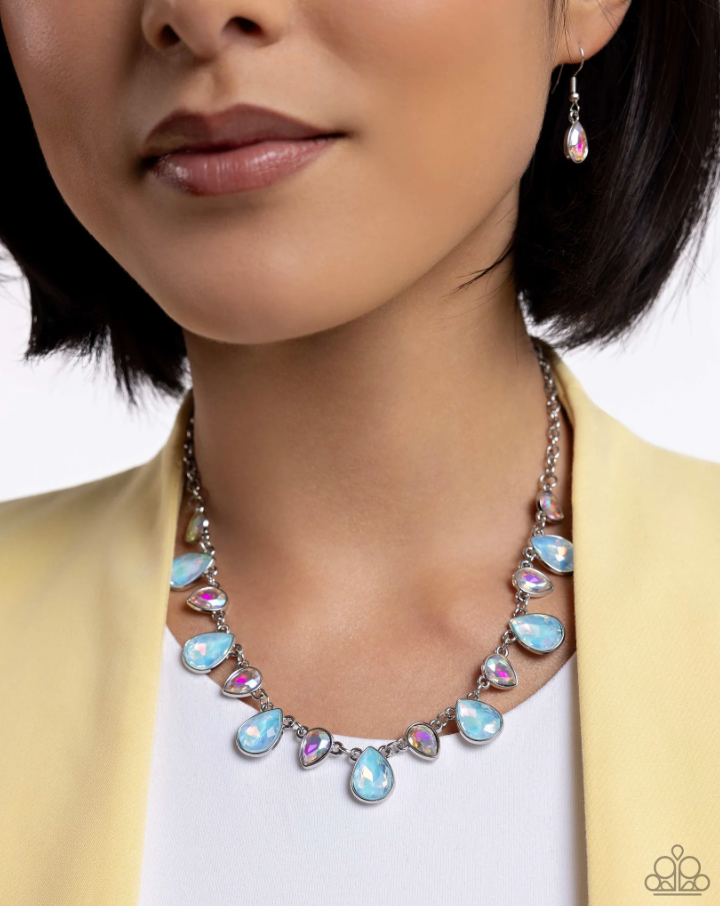 Alternating in direction, a collection of big opalescent blue and small iridescent teardrops in silver frames coalesce along a silver chain below the neckline for a sweet, summer-inspired statement. Features an adjustable clasp closure.