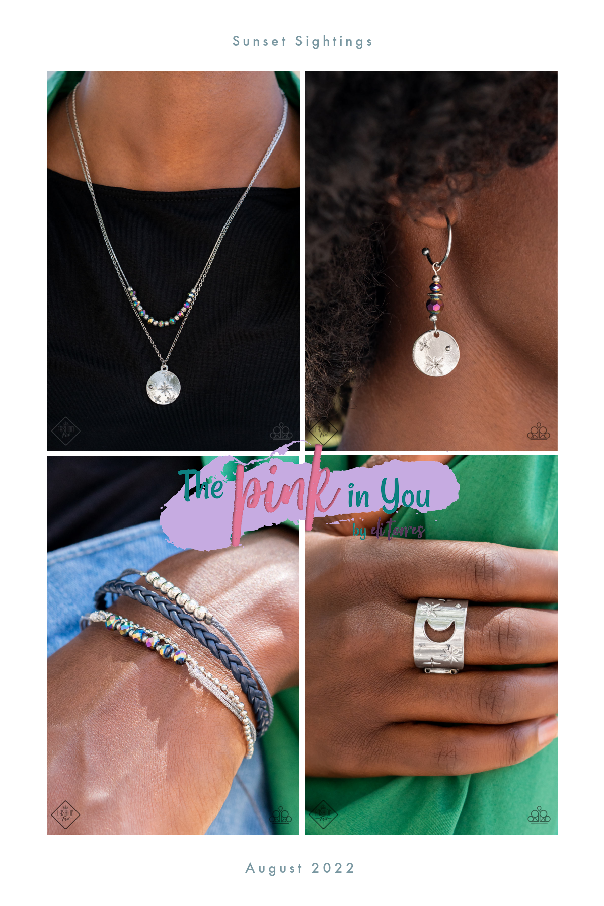 Incluye uno de cada accesorio que aparece en la combinación de tendencias Sunset Sightings en Fashion Fix de agosto: