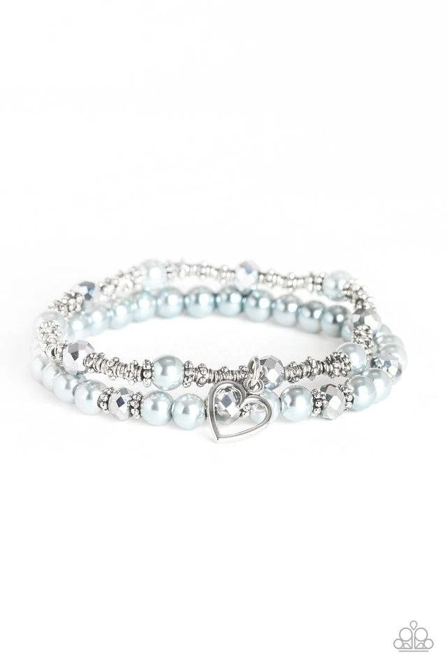 Infundido con un encantador dije de corazón, una variedad de perlas plateadas, cuentas de hematita facetadas y delicados detalles plateados se enhebran a lo largo de bandas elásticas alrededor de la muñeca para una apariencia romántica.