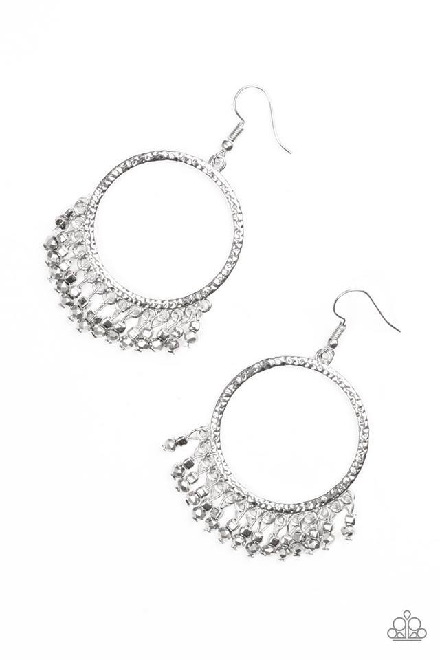 Cuentas de hematita facetadas y cuentas de cubo de plata cuelgan de la parte inferior de un aro de plata martillada, creando un fleco coqueto. El pendiente se fija a un accesorio de anzuelo estándar.