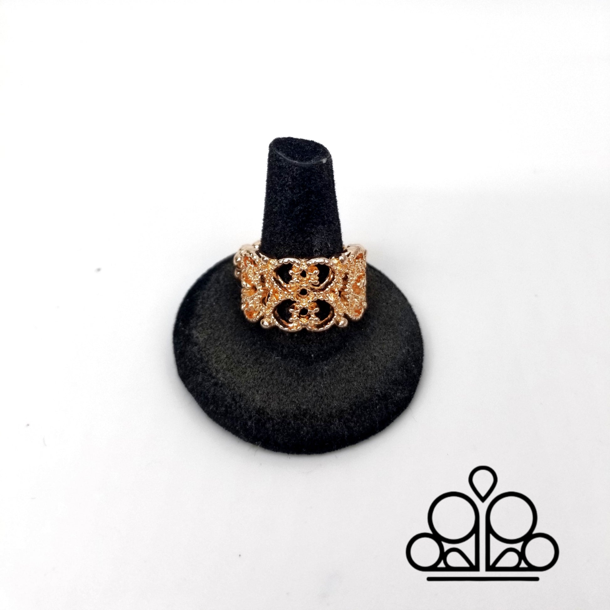 Las filigranas de oro rosa brillante forman un patrón floral con volantes en la parte superior del dedo y se fusionan para formar un marco extravagante que le da un aspecto estacional. Cuenta con una banda elástica para un ajuste flexible.
