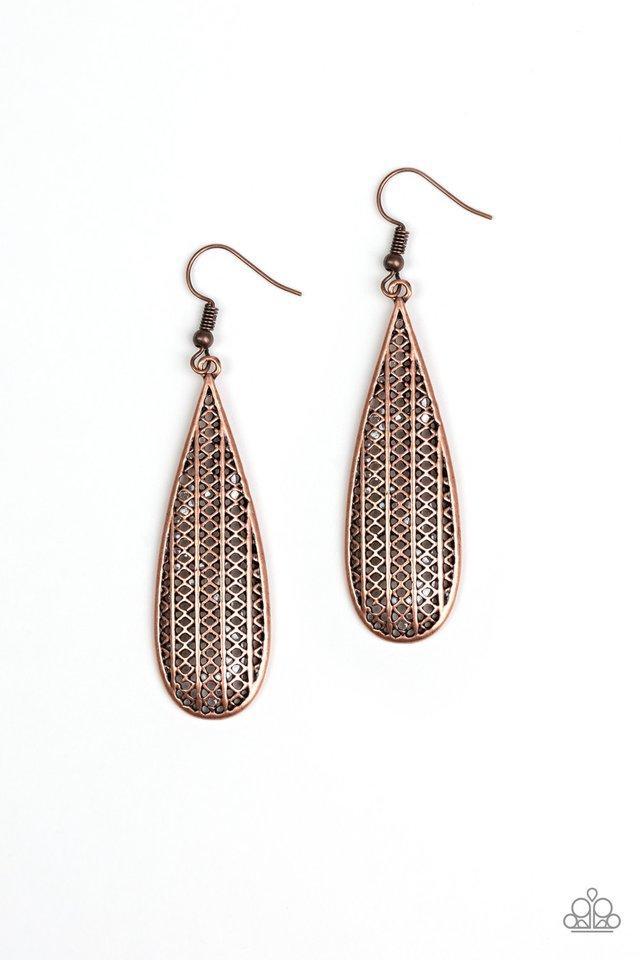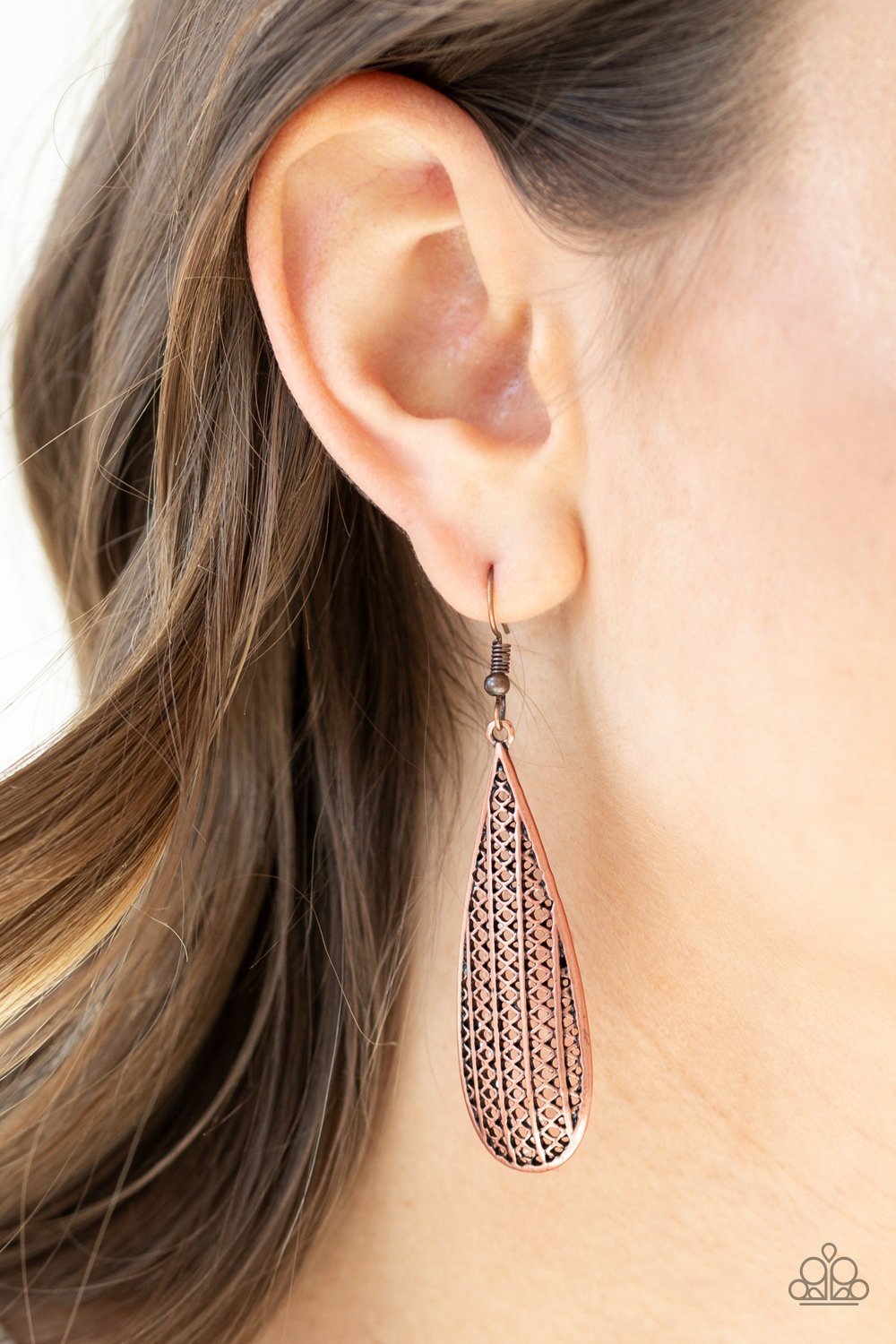Con patrones similares a diamantes, un marco de lágrima de cobre envejecido se balancea desde la oreja para lograr un estilo de inspiración tribal. El pendiente se sujeta a un accesorio de anzuelo estándar.