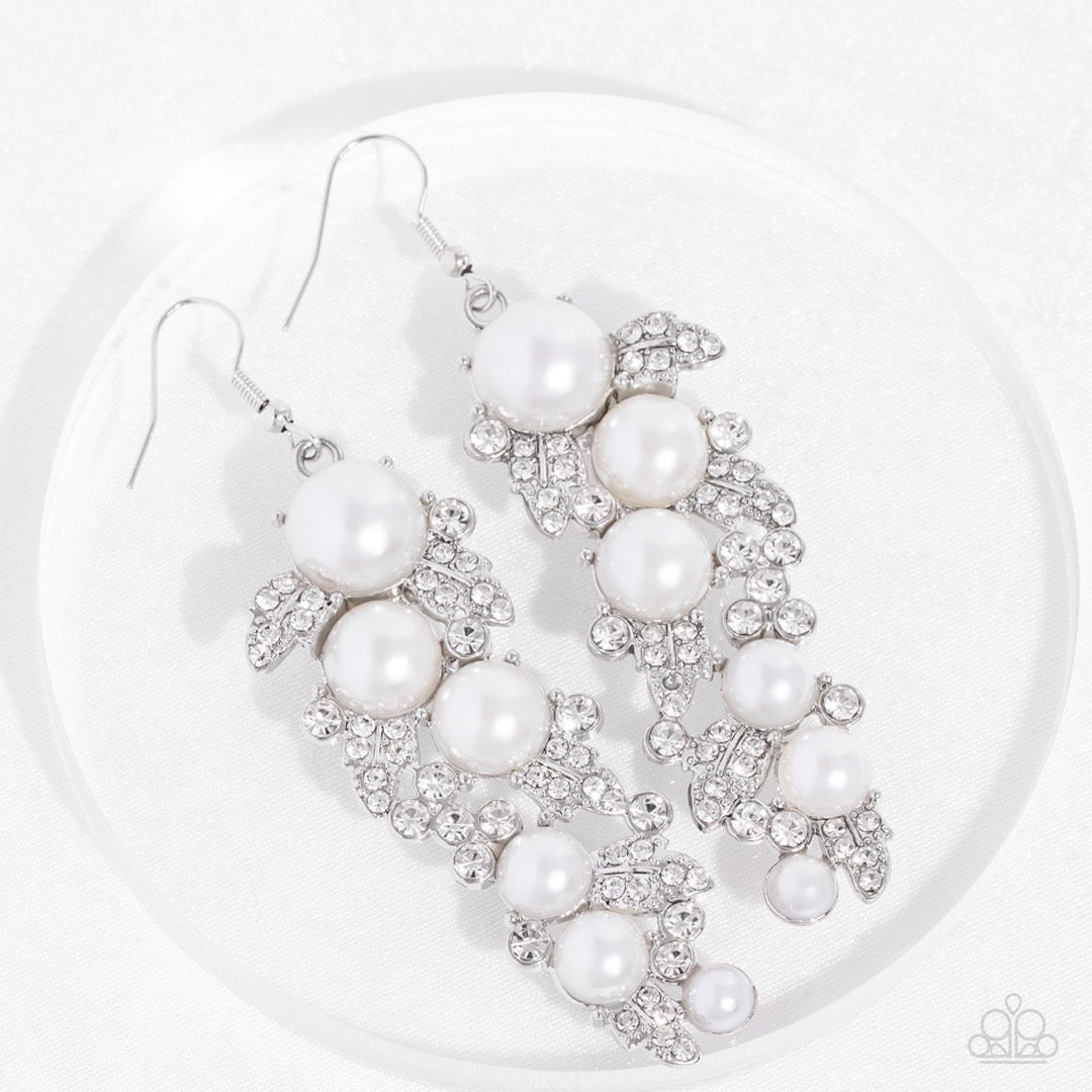 Las perlas blancas caen en cascada en distintos tamaños rodeadas de brillantes diamantes de imitación blancos para lograr un aspecto deslumbrante. El pendiente se fija a un gancho estándar.