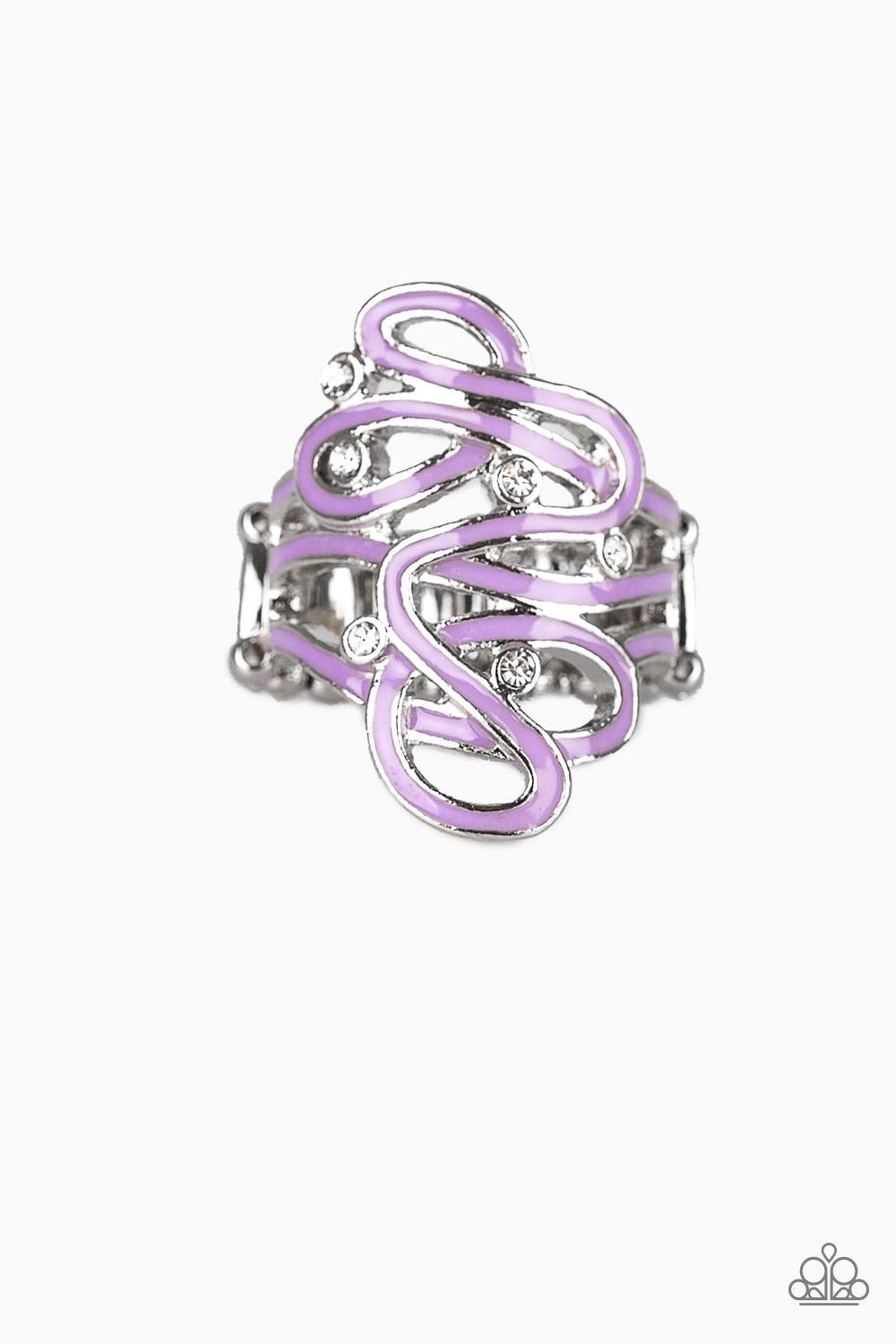 Pintado con un acabado violeta brillante, relucientes cintas plateadas se arremolinan alrededor de delicados diamantes de imitación blancos y se fusionan para formar un marco caprichoso sobre el dedo. Cuenta con una banda elástica para un ajuste flexible.