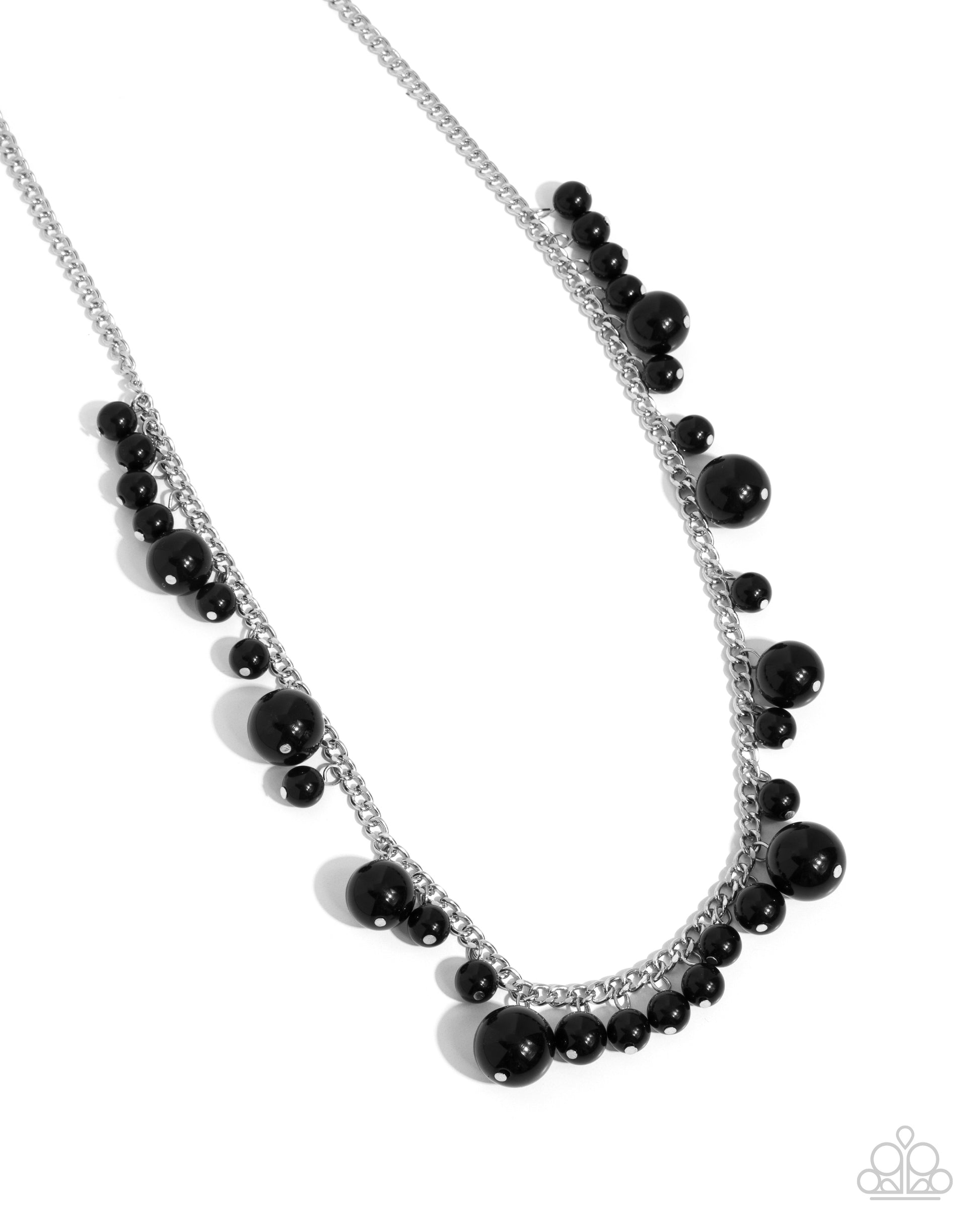 Cuentas negras burbujeantes de distintos tamaños que se deslizan a lo largo de una cadena plateada brillante para lograr un estilo refinado. Cuenta con un cierre de broche ajustable.