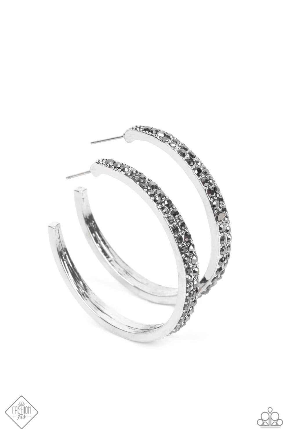 Con incrustaciones de delicados diamantes de imitación de hematita, una barra de plata se curva en un aro, lo que da como resultado un señuelo ardiente y vanguardista. El pendiente se fija a un poste estándar. El aro mide aproximadamente 2" de diámetro.