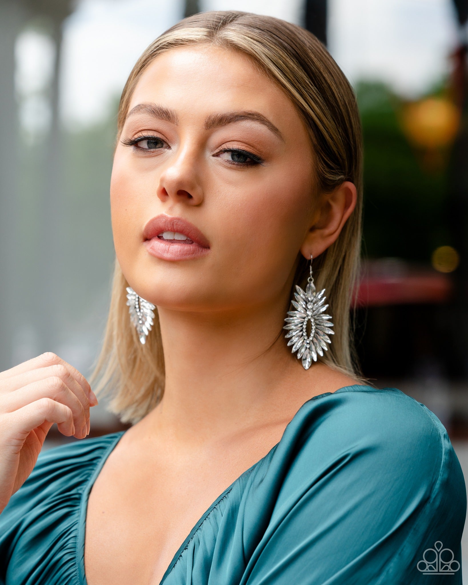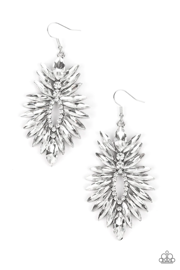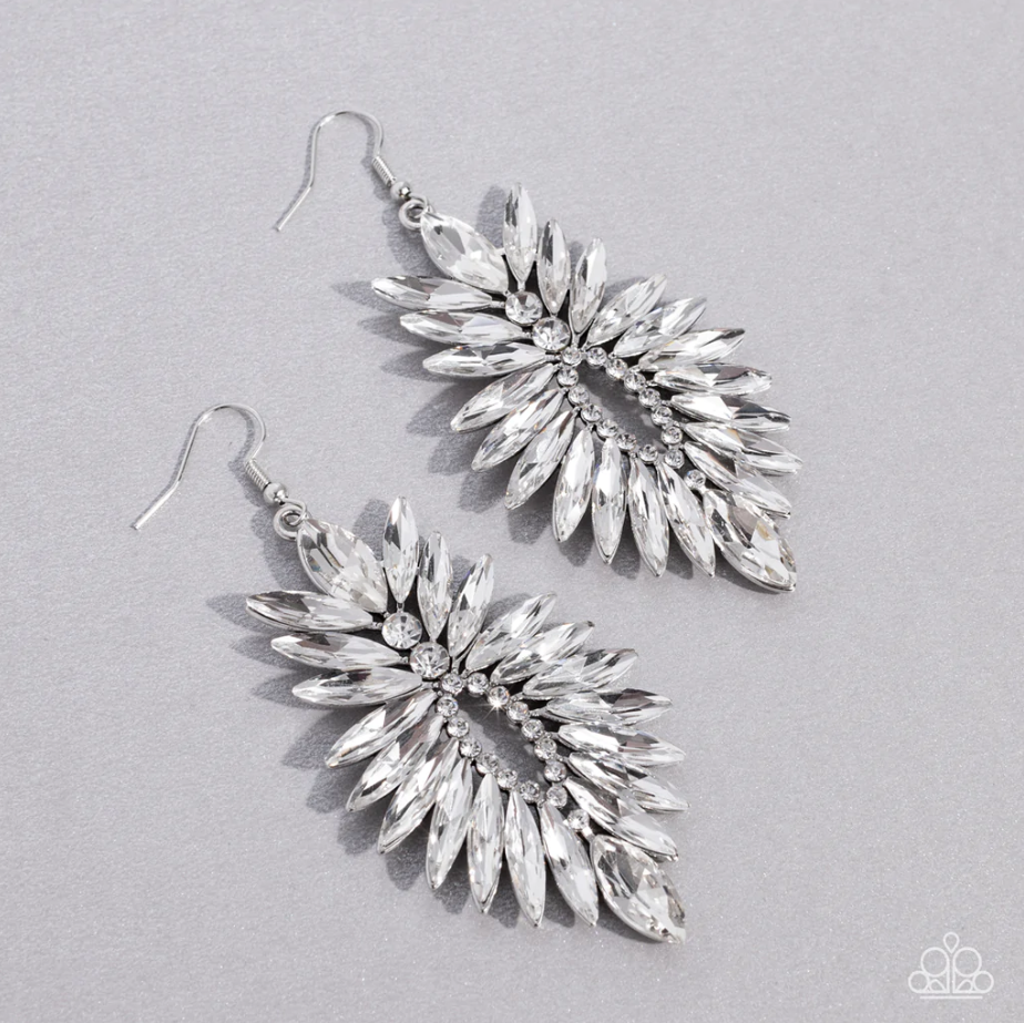 Una explosión de diamantes de imitación blancos de talla marquesa se despliega desde un anillo de delicados diamantes de imitación blancos y se fusiona para formar una pieza de declaración irresistiblemente gélida. El pendiente se fija a un accesorio de anzuelo estándar.