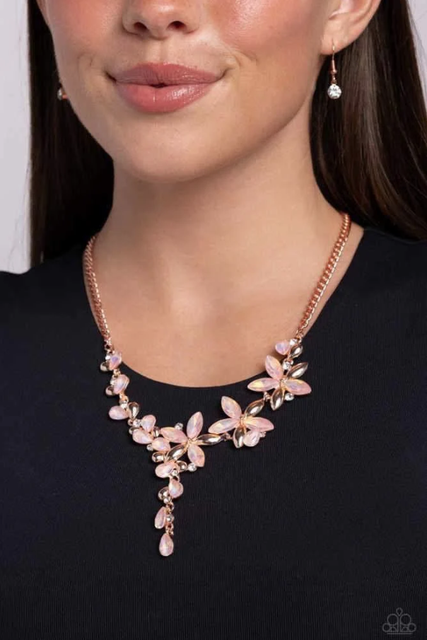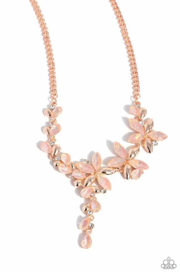 A shiny copper chain gives way to a collection of opalescent peachy marquise-cut rhinestones and shiny copper petals that bloom into a feminine display of flowers. White rhinestones in shiny copper fittings are interspersed along the elongated display for additional shimmer. Features an adjustable clasp closure.