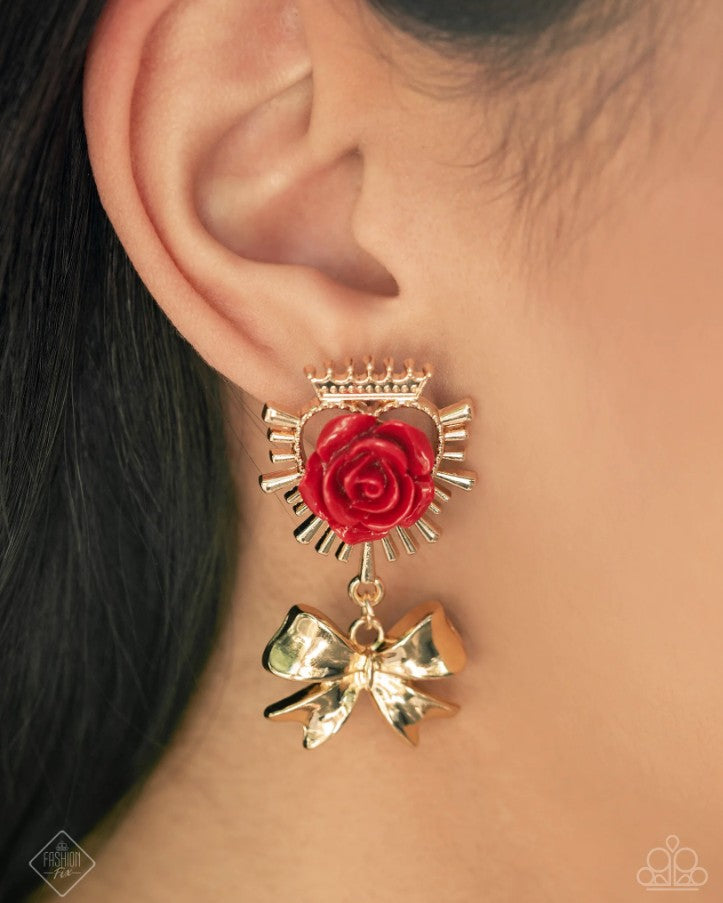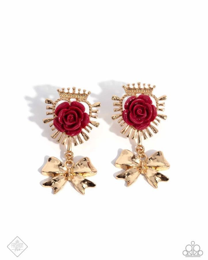 Blooming atop a gold, royal crown-inspired, airy coat of arms, a wine acrylic rosette glistens from the ear, giving way to a high-sheen gold bow that sways below the ear for a fashionably formal look. Earring attaches to a standard post fitting.