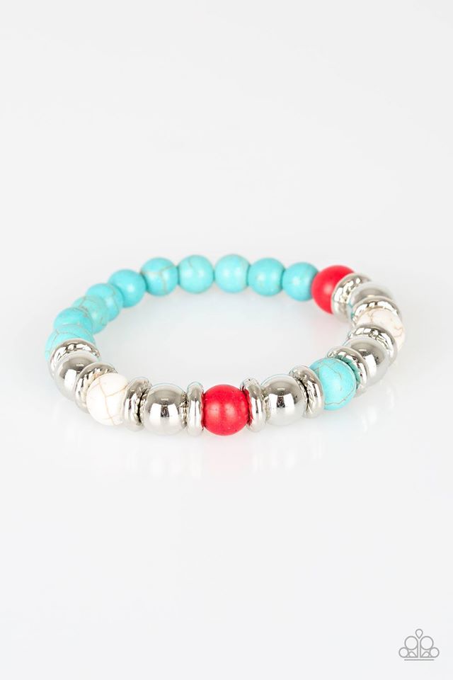 A collection of earthy turquoise, red, and white stone beads and shimmery silver accents are threaded along a stretchy band for a seasonal look.