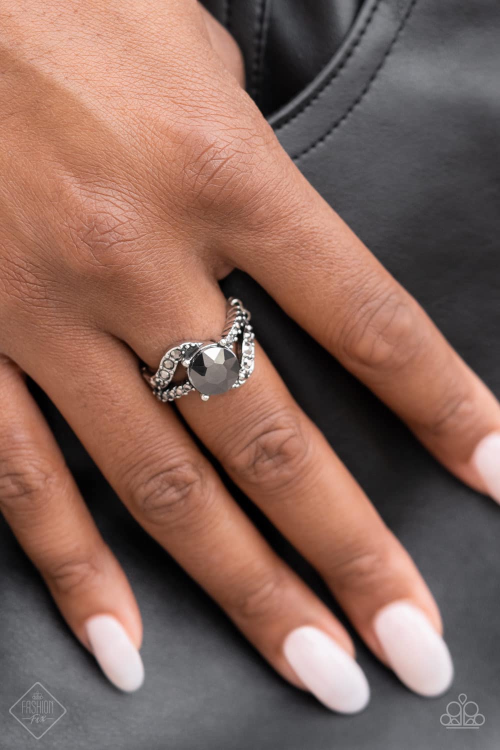 A faceted hematite bead in a silver-prong setting makes a glamorously edgy centerpiece as it floats over the top of two silver bands. Encrusted with dainty hematite rhinestones, the wavy silver bands add depth and dimension to the smoldering display atop the finger.