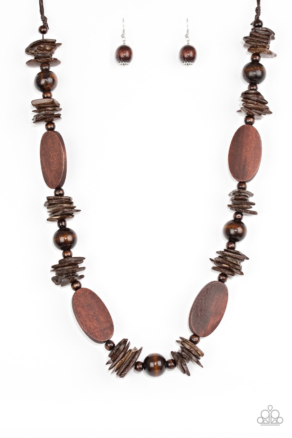 Shell-like, round, and flat wooden beads are threaded along shiny brown cording, creating a summery palette. Features an adjustable sliding knot closure.