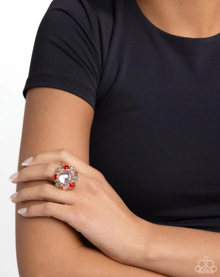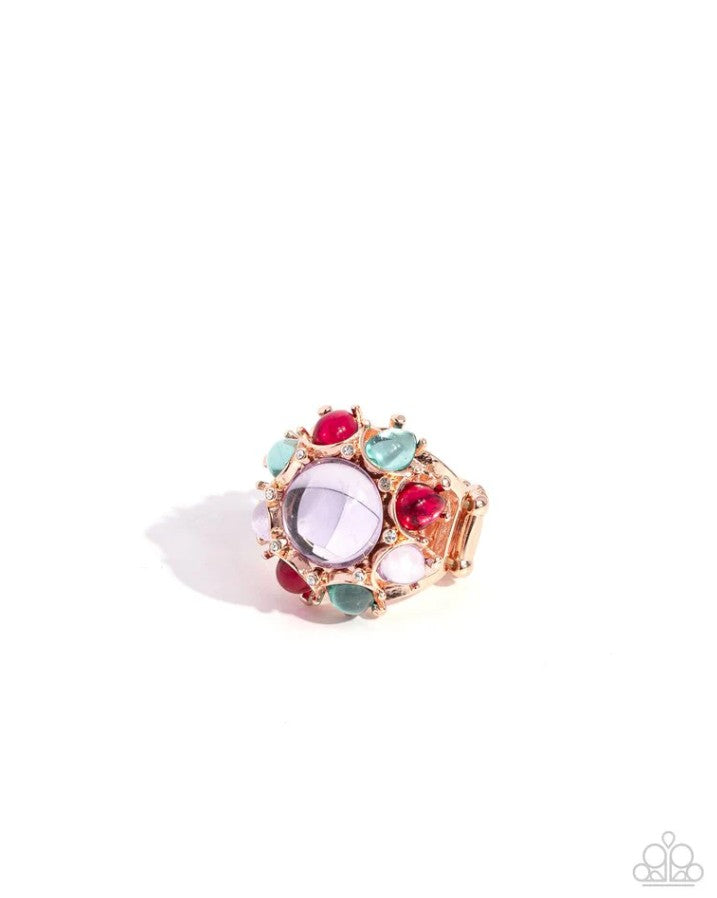 Embodying a vibrant fusion of color and artistry, this striking centerpiece captivates with its shimmering copper-pronged frame. Surrounding an oversized transparent white gem, delicate turquoise and pink acrylics in both round and teardrop shapes create a harmonious design. Dotted with dainty white rhinestones, the interior radiates elegance, while a stretchy band ensures a comfortable, adaptable fit for any finger.
