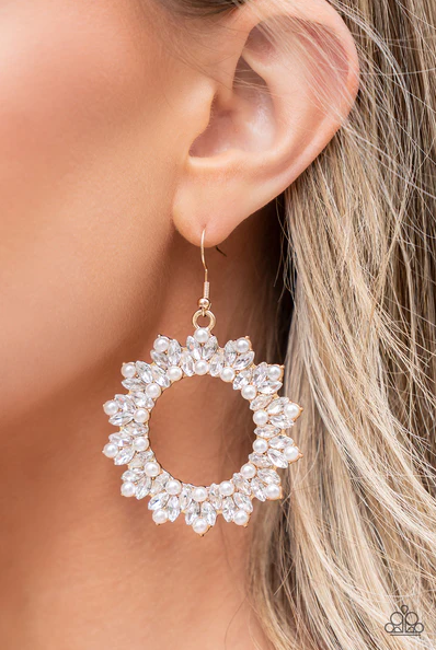 A bubbly collection of dainty white pearls and marquise-cut rhinestones explodes across the front of a gold wreath, resulting in jaw-dropping dazzle. Earring attaches to a standard fishhook fitting.