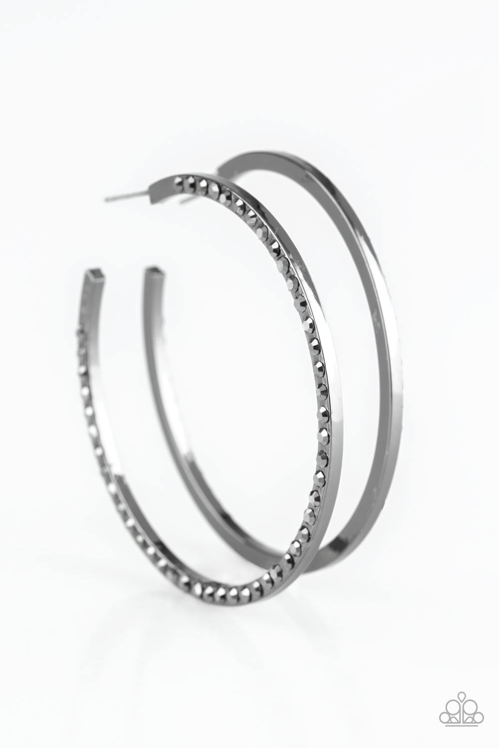 Radiating with glittery hematite rhinestones, a glistening gunmetal hoop curls around the ear for a sassy shimmer. Earring attaches to a standard post fitting. Hoop measures 2 1/4" in diameter.