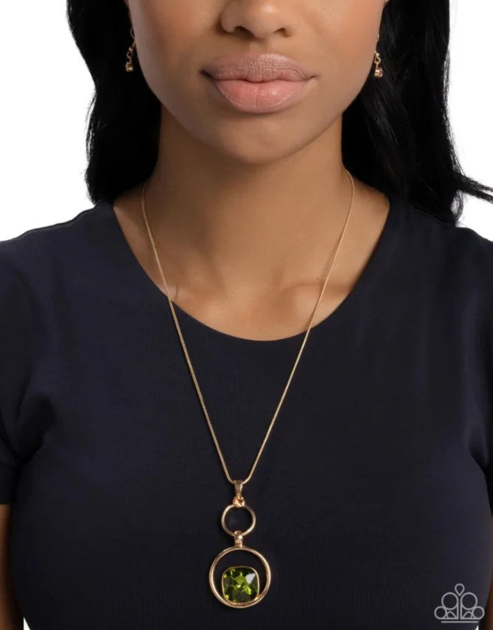 Varying sizes of connected gold circles swing from a lengthened gold snake chain from a gold bail clasp. A soft peach rhinestone is embellished atop the first smaller circle while a defaced green rounded square gem is set along the center of the larger gold hoop, for a dazzling, genteel approach. Features an adjustable clasp closure.