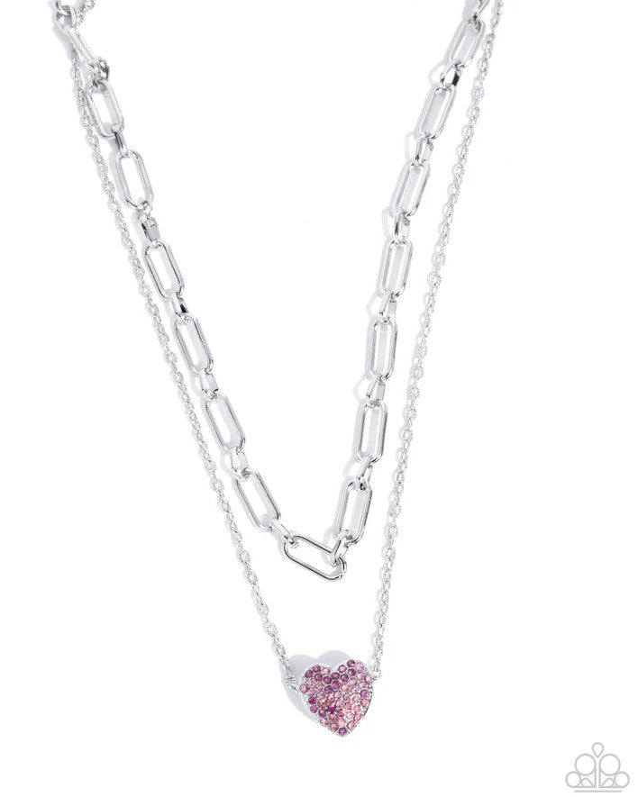 Layered silver chains feature a combination of delicate and chunky chain links. A pink rhinestone-encrusted heart pendant is suspended from the daintier strand, creating a romantic focal point. Features an adjustable clasp closure.
