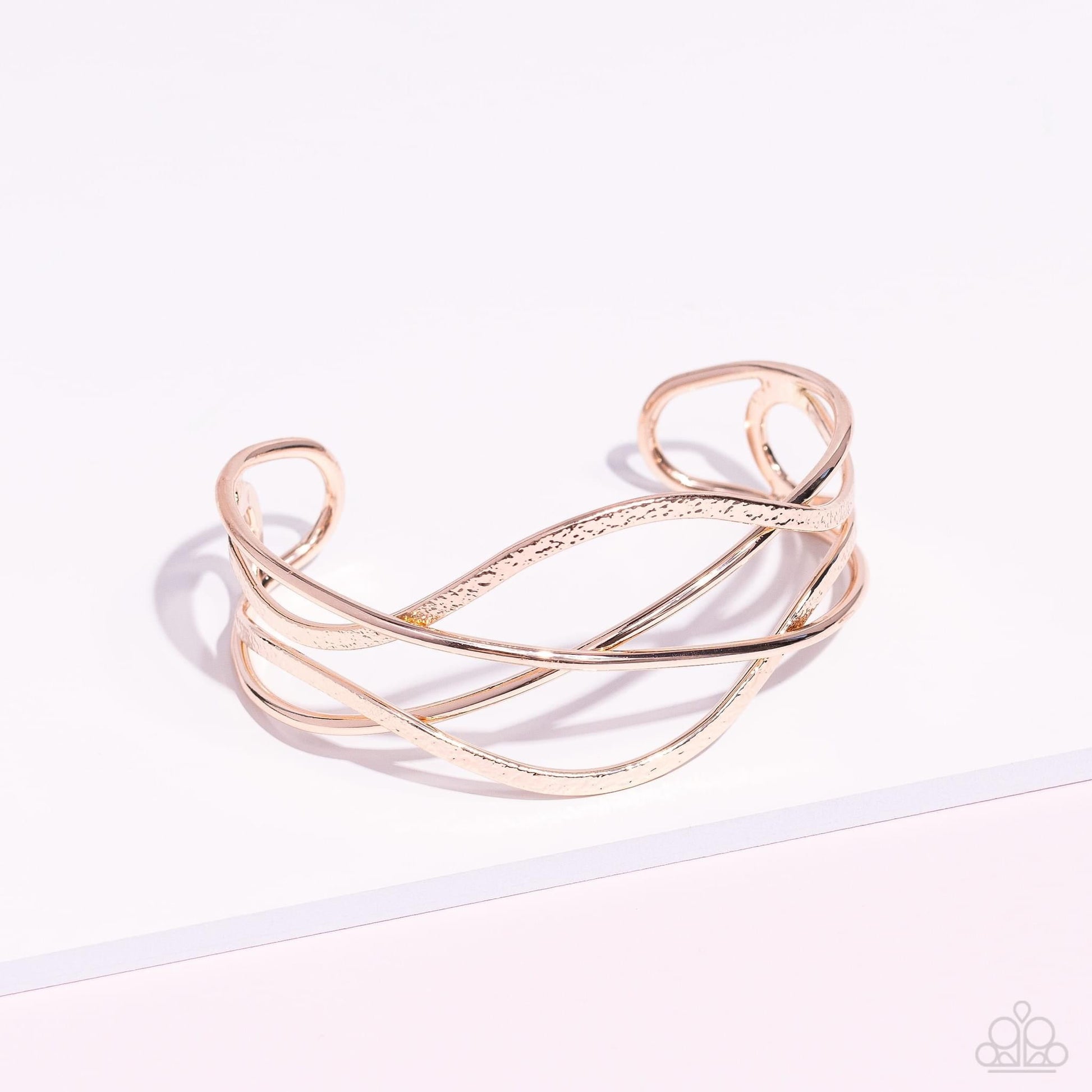 Shiny rose gold bars and hammered rose gold ribbons delicately crisscross and whirl around the wrist into a solitaire cuff, creating a flawless fusion of metallic shimmer.