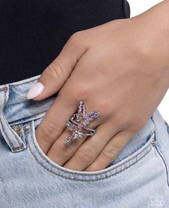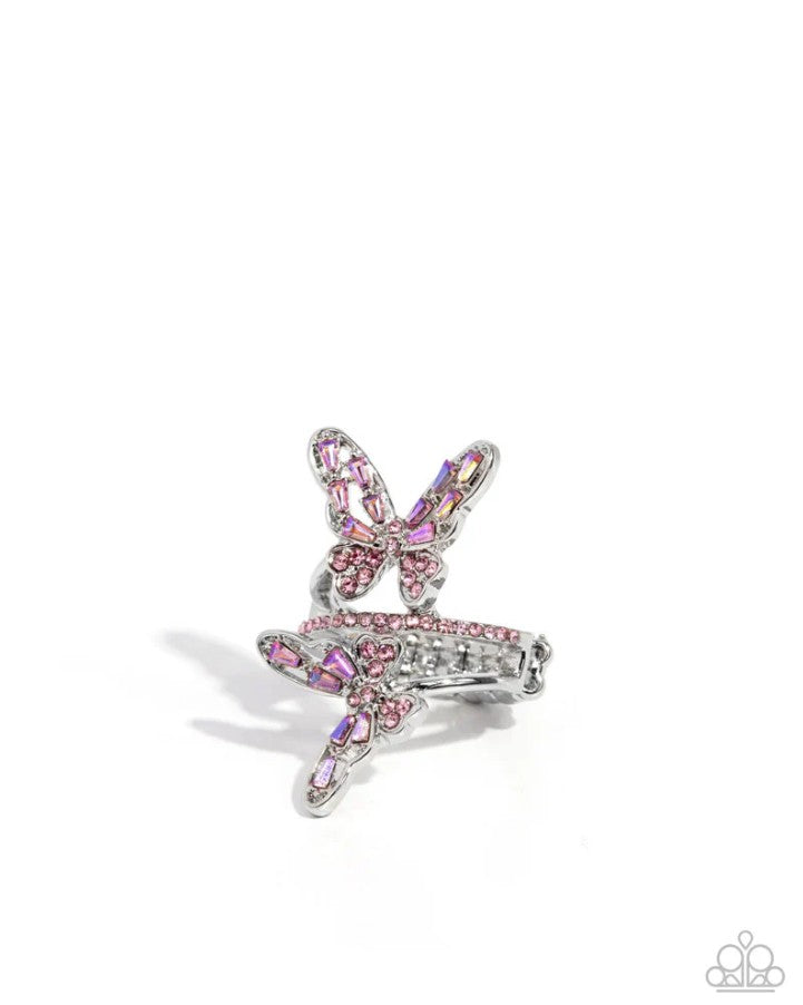 Two silver butterflies, encrusted with radiant pink rhinestones and sparkling UV baguette-cut accents, flutter across a layered band. The intricate detailing creates a whimsical and enchanting design, perfect for adding a pop of color and elegance to any look. Features a stretchy band for a flexible fit.