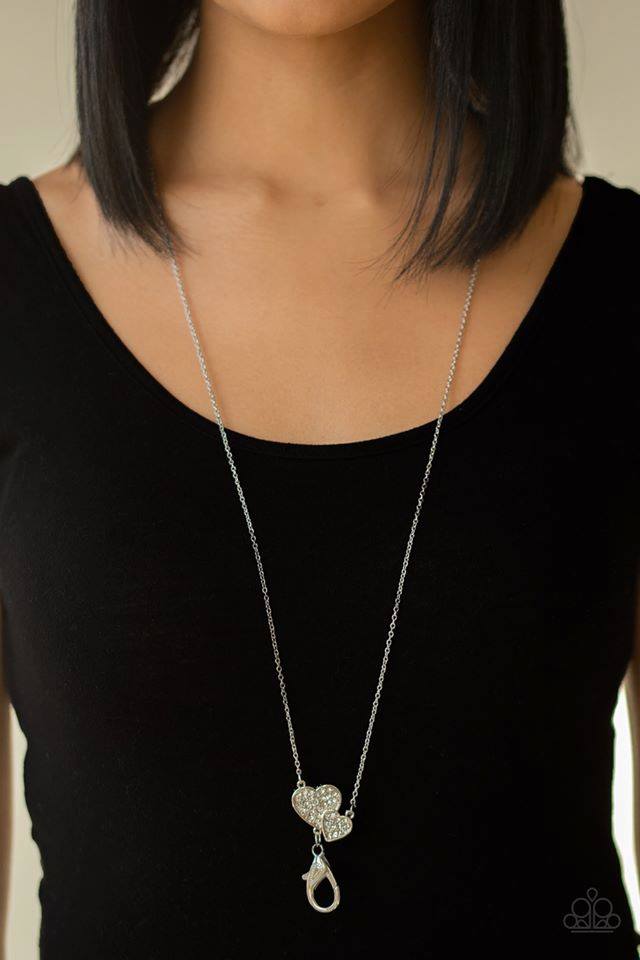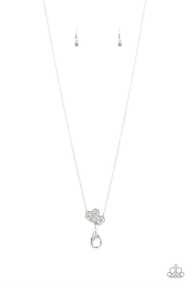 Two white rhinestone encrusted hearts join at the bottom of a lengthened silver chain, creating a charming pendant. A lobster clasp hangs from the bottom of the design to allow a name badge or other item to be attached. Features an adjustable clasp closure.