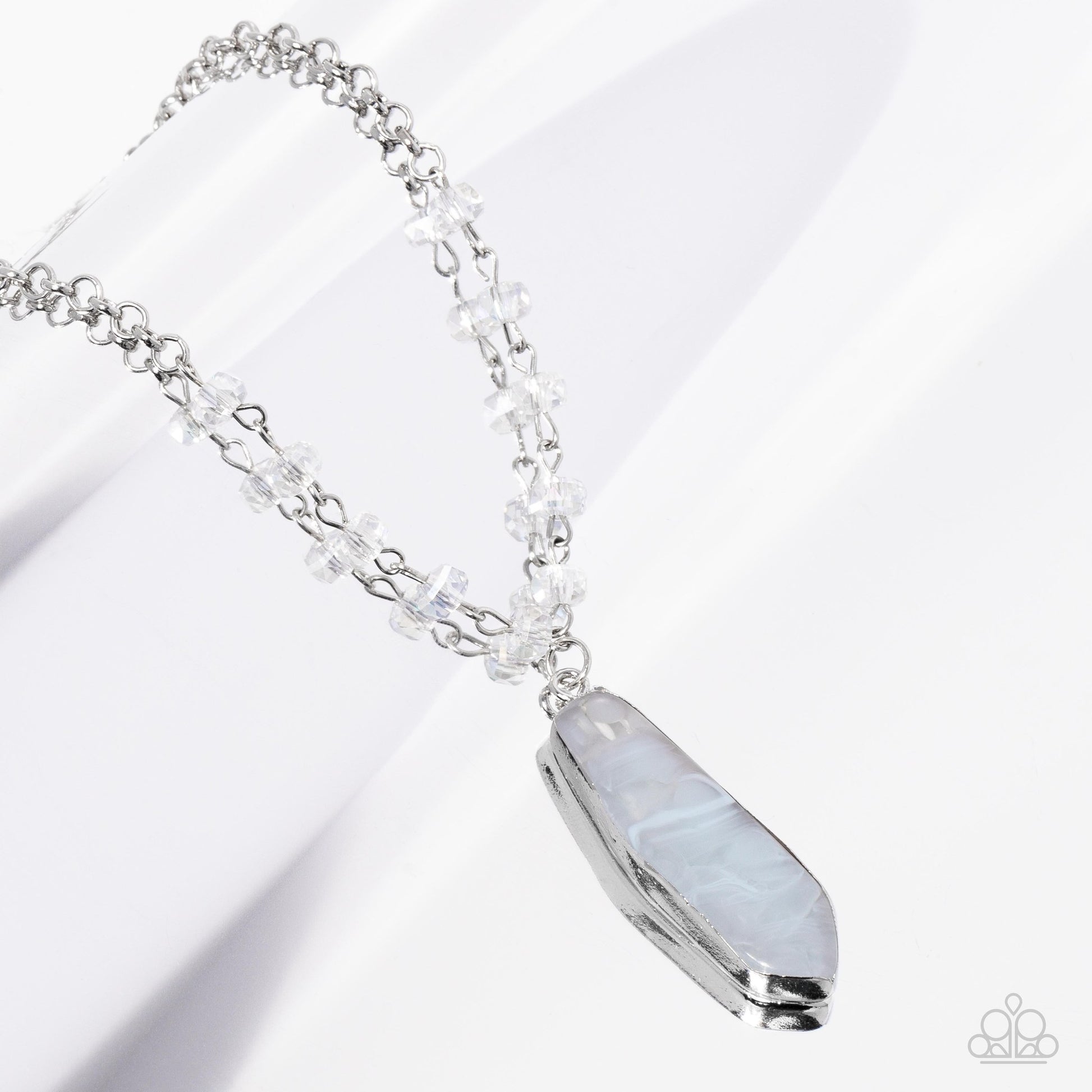 Featuring a faux stone finish, Glacier Lake smoke is encapsulated in an acrylic frame below the collar. Glittery crystal-like beads sparkle along the silver chain, drawing attention to the mystical pendant. Features an adjustable clasp closure. Due to is prismatic palette, color may vary.