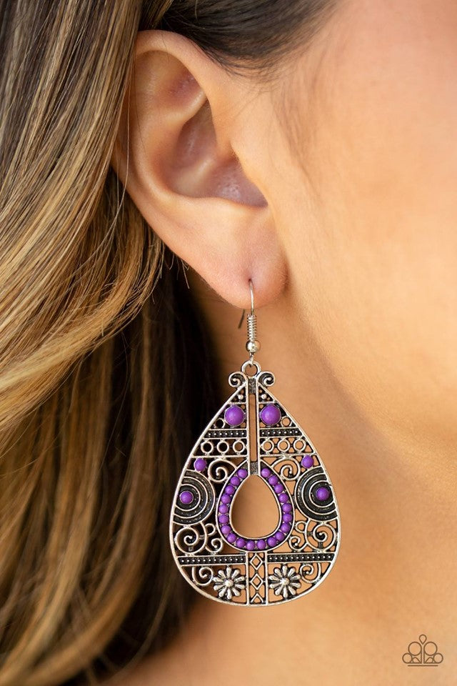 Swirling with flowery and geometric filigree, an ornate silver teardrop is dotted in dainty purple beads for a colorful finish. Earring attaches to a standard fishhook fitting.