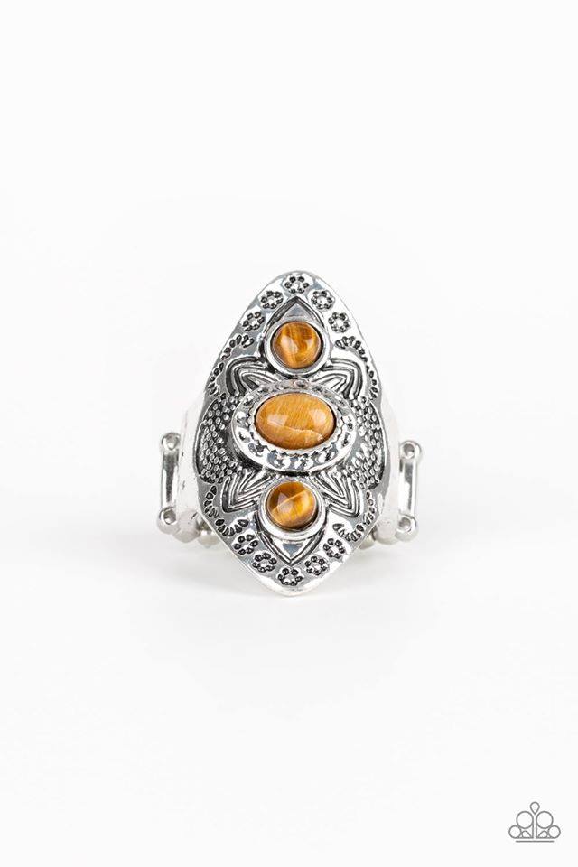 Stamped and studded in tribal inspired patterns, a thick silver frame folds around the finger. Glassy tiger's eye stones are pressed down the ornate frame for a colorful finish. Features a stretchy band for a flexible fit.
