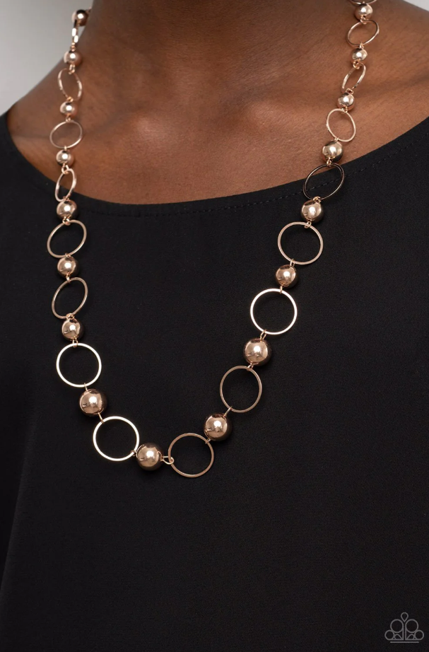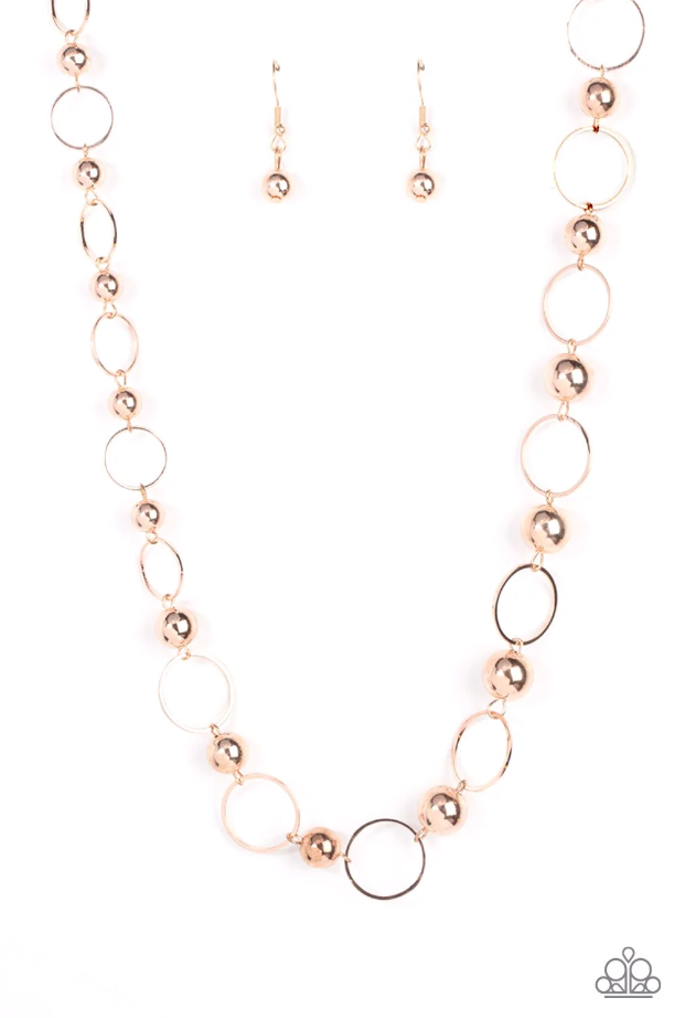 Gradually increasing in size, a glistening collection of shiny copper beads and shiny copper hoops alternate across the chest for a classic metallic fashion. Features an adjustable clasp closure.