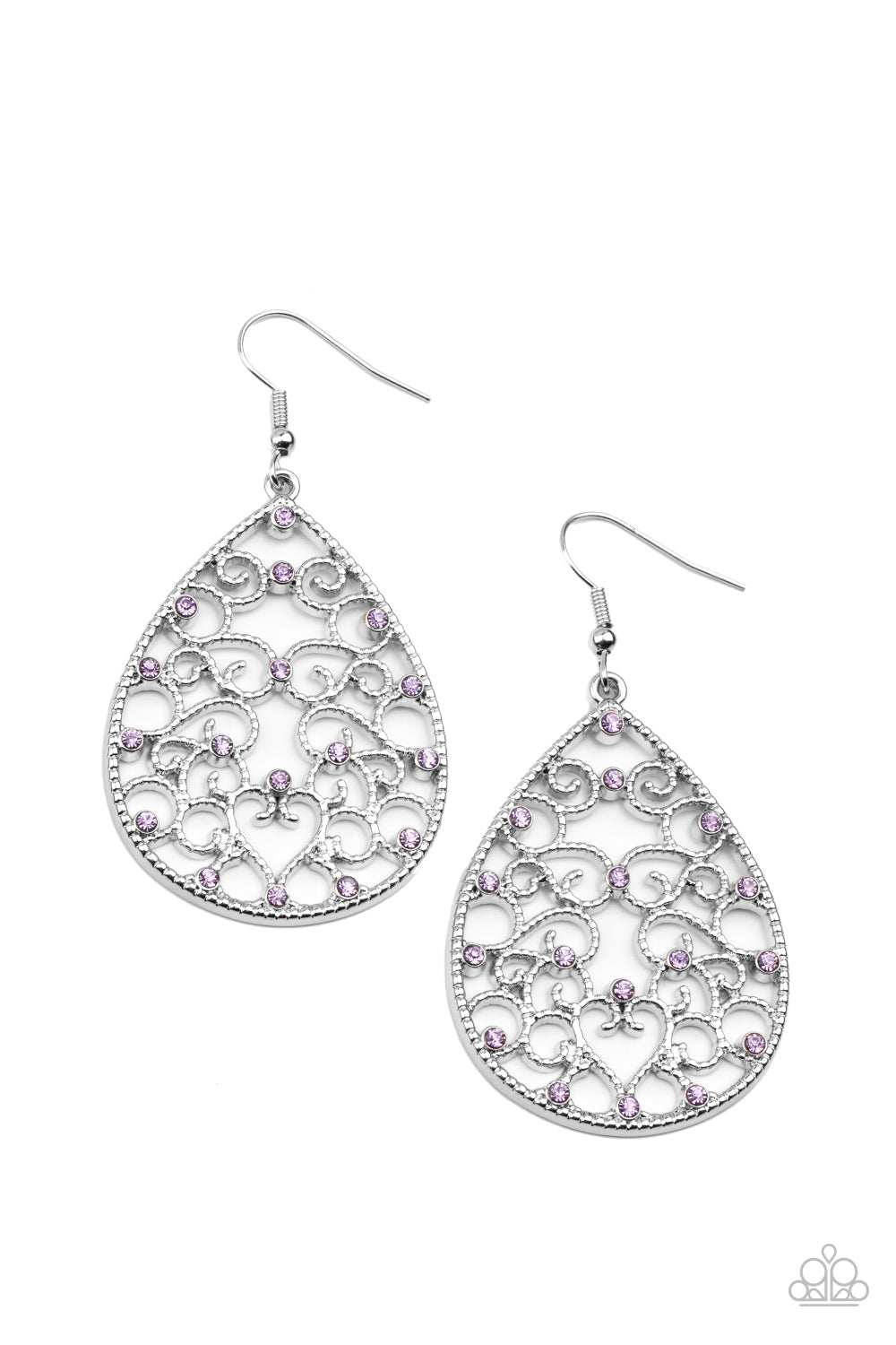 Dotted with dainty purple rhinestones, studded silver filigree vines across the front of a silver teardrop frame for an enchanting look. Earring attaches to a standard fishhook fitting.