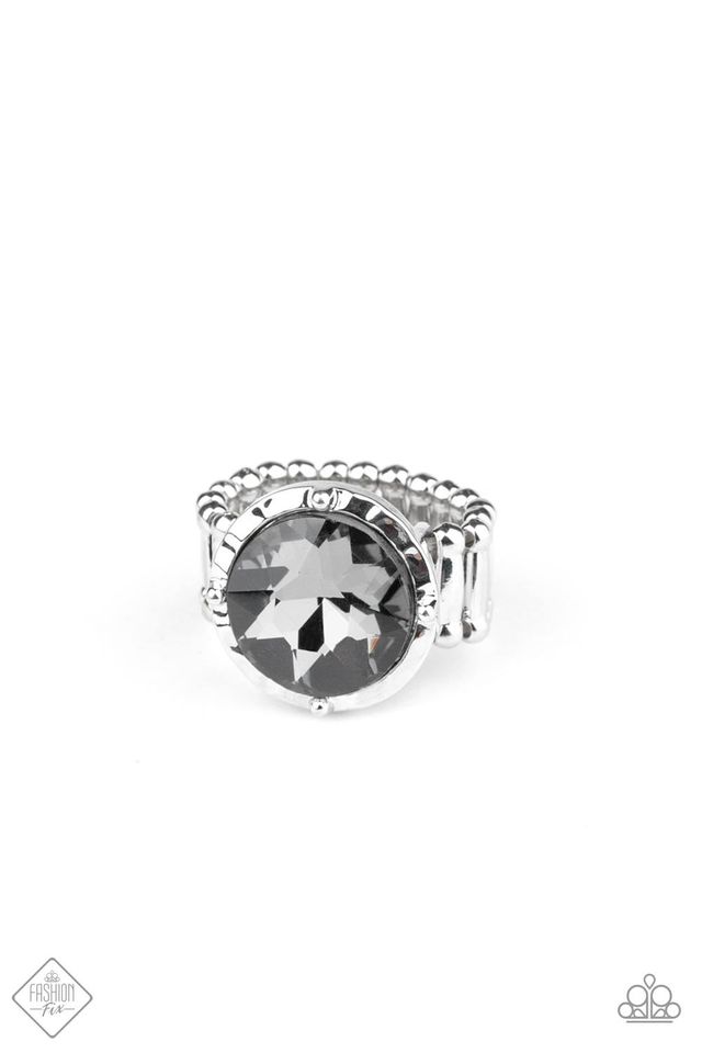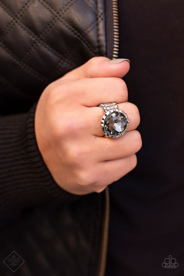 An oversized smoky gem is nestled inside of a delicately hammered silver fitting, creating a dramatic centerpiece that sits boldly atop the finger. Features a stretchy band for a flexible fit.