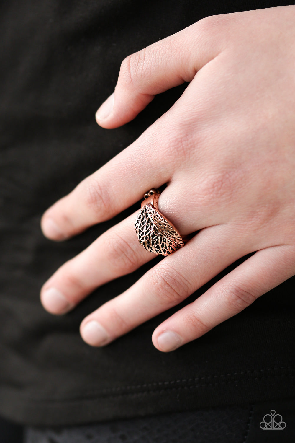 Brushed in an antiqued shimmer, a lifelike copper leaf curls across the finger in a seasonal fashion. Features a dainty stretchy band for a flexible fit.