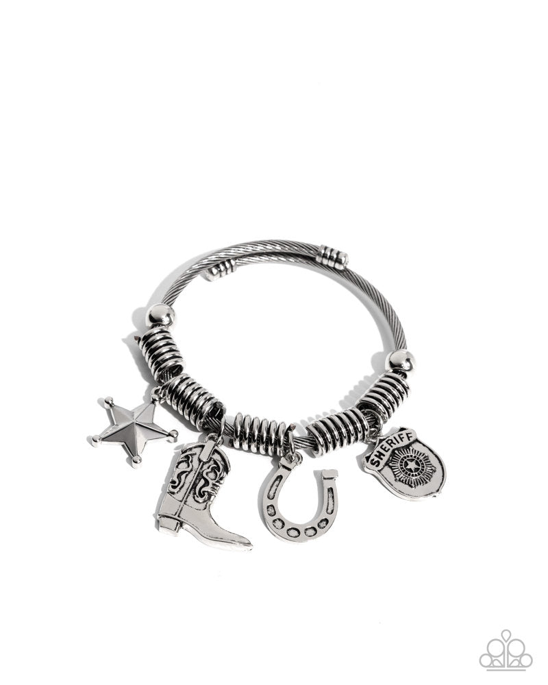 A coiled silver rope-like wire is adorned with western-inspired charms, including a sheriff's badge, a cowboy boot, a horseshoe, and a star, for a rustic and playful design. The sleek metallic finish and detailed engravings lend a touch of charm to the piece, while the flexible cuff design ensures easy wear.