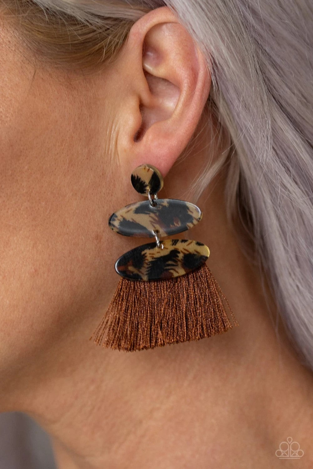 Featuring cheetah-like print, glassy frames link into a stacked lure. A fringe of shiny brown thread streams from the bottom of the lure for a retro finish. Earring attaches to a standard post fitting.