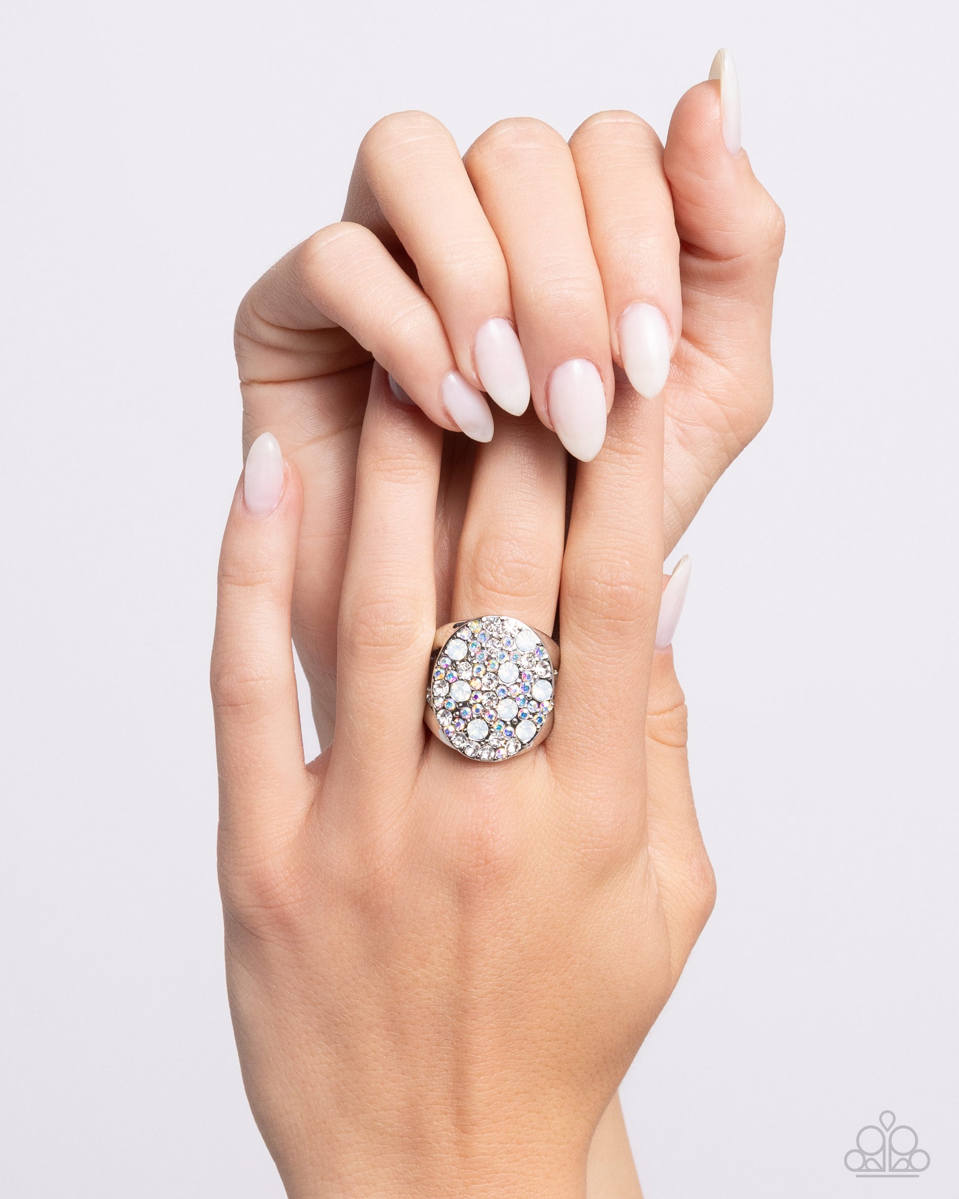 Stacked in a sumptuous pattern, various opalescent, white, and iridescent gems shimmer across the surface of a silver disc for a dazzling centerpiece atop the finger. Features a stretchy band for a flexible fit. Due to its prismatic palette, color may vary.