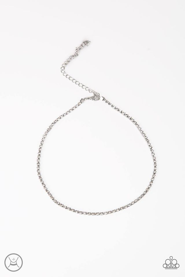 Pressed into sleek silver square frames, a strand of glittery white rhinestones wraps around the neck for an edgy look. Features an adjustable clasp closure.