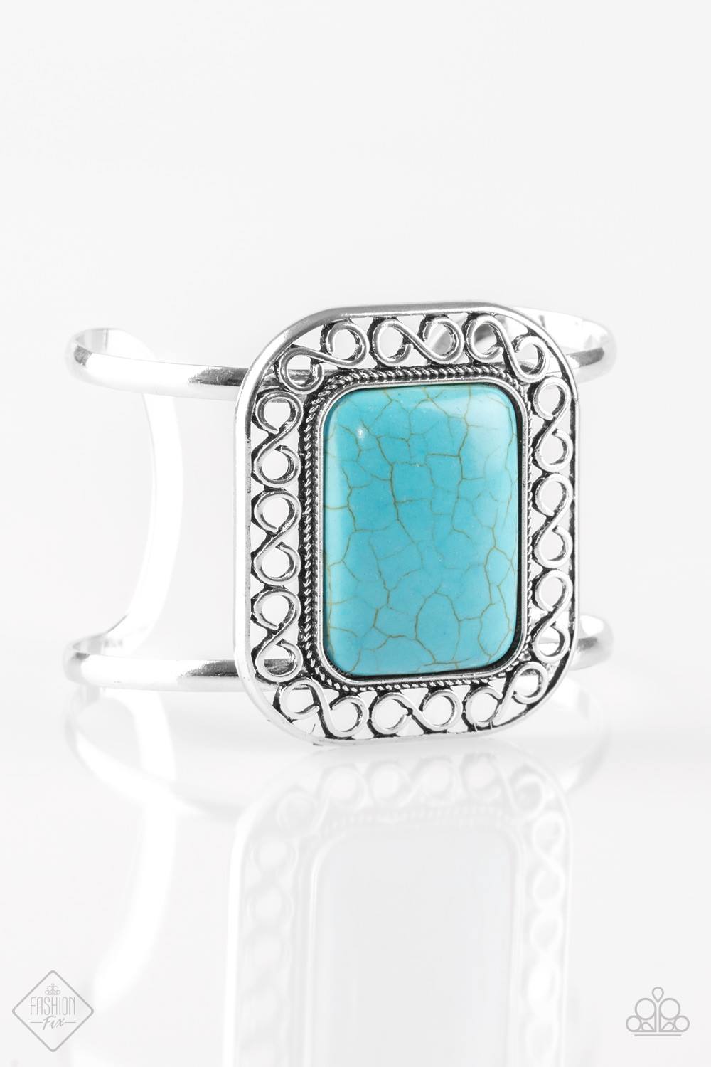Chiseled into a tranquil rectangle, a turquoise stone is pressed into a shimmery silver frame swirling with texture for an artisan-inspired look. The earthy frame sits atop an airy silver cuff, creating a seasonal centerpiece.