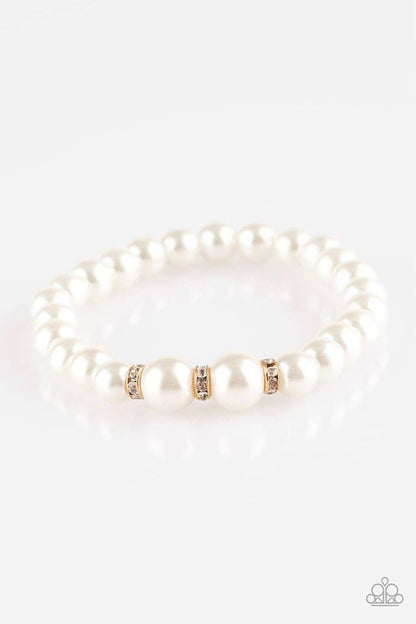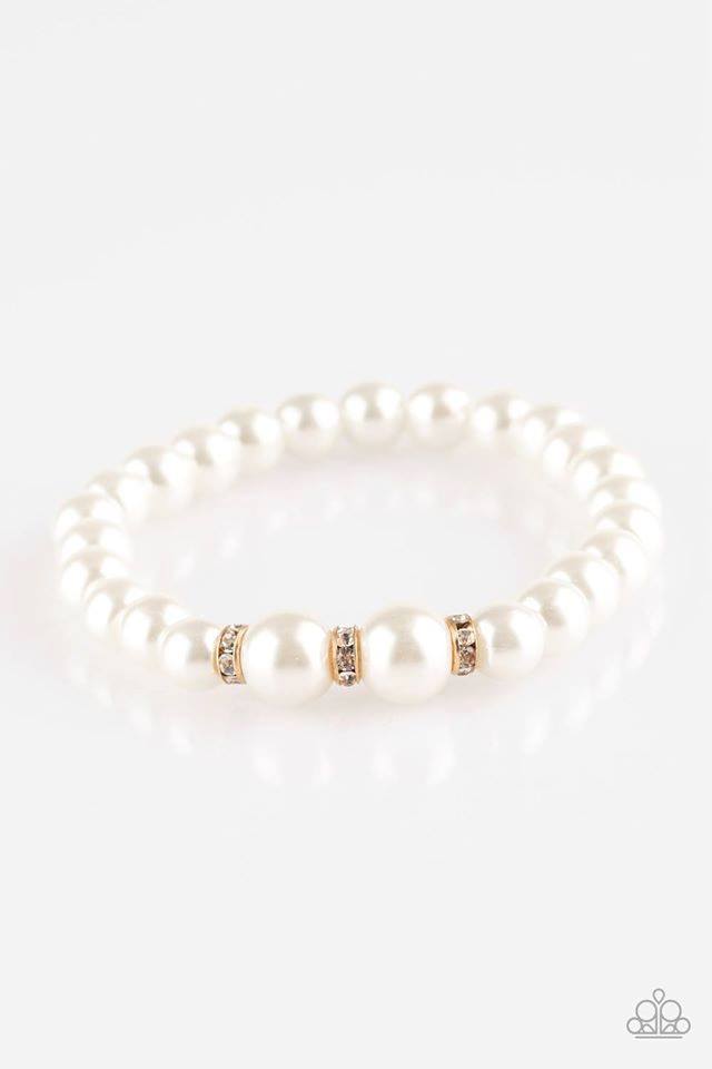 Gradually increasing in size near the center, luminescent white pearls are threaded along a stretchy elastic band. White rhinestone encrusted rings are sprinkled along the pearls for a timeless finish.