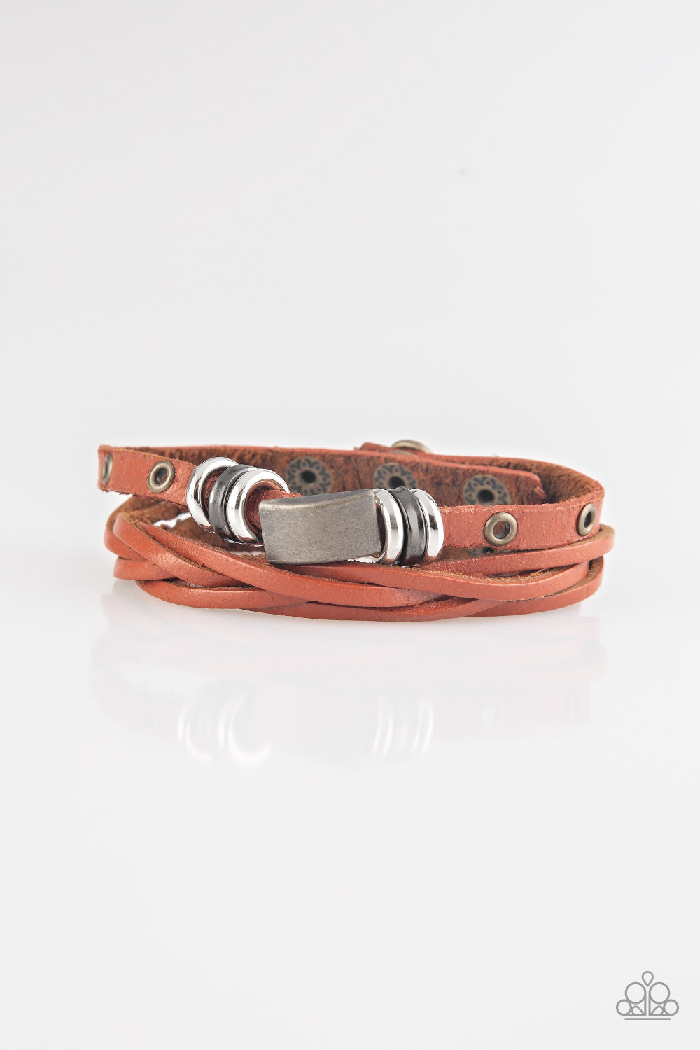 Infused with metallic accents, a brown leather band joins a braided leather band around the wrist for a mismatched rugged look. Features an adjustable snap closure.