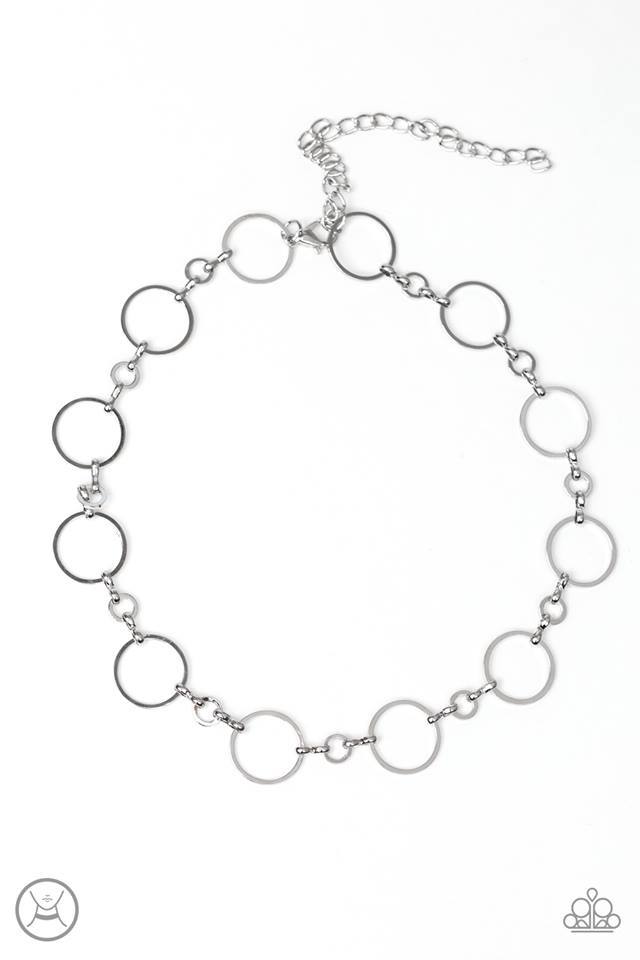 A collection of glistening silver hoops connect around the neck for a sleek look. Features an adjustable clasp closure.