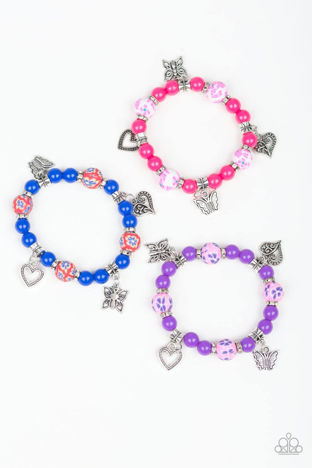 Stretchy bracelets with charms of butterflies and hearts . Beads vary in shades of blue, purple, and pink.