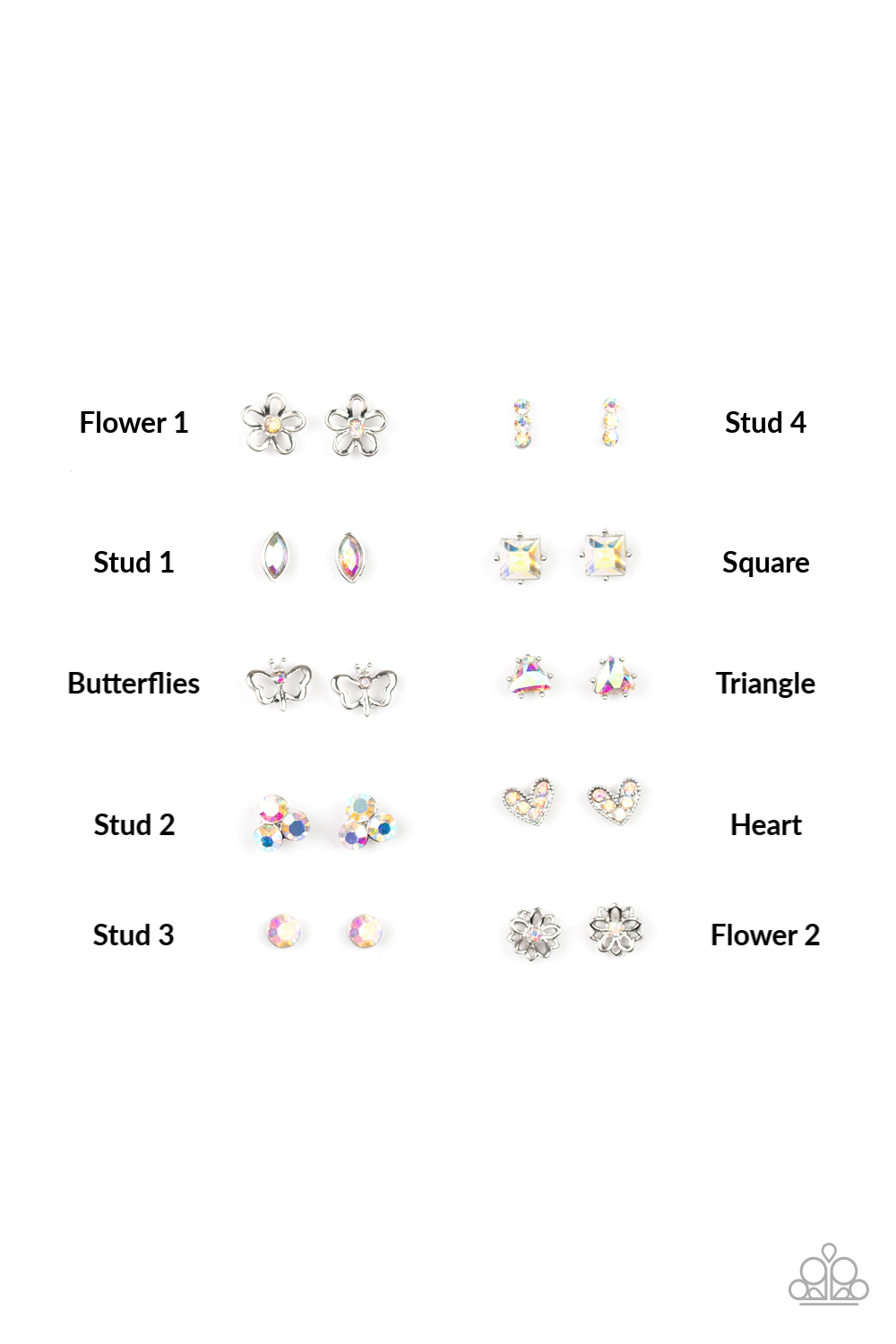 Featuring iridescent multicolored rhinestones, the silver frames vary in shapes of butterflies, hearts, flowers, circles, triangles, squares, and abstract geometric shapes. Earrings attach to standard post fittings.