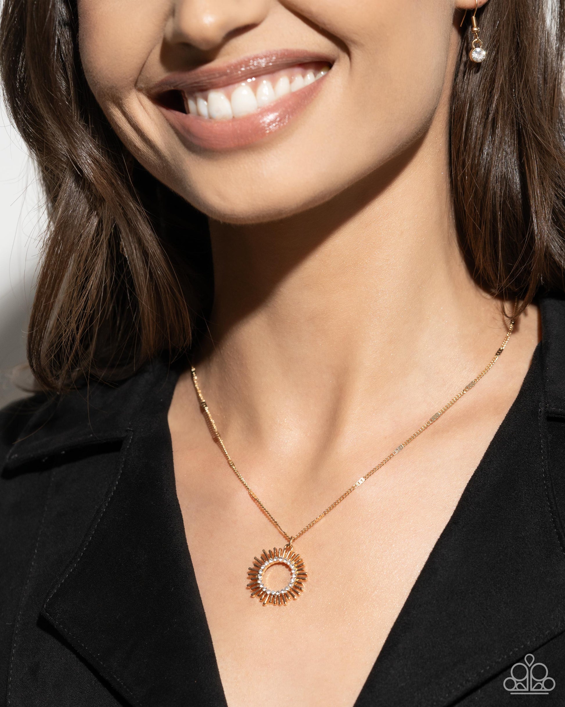 Gliding along a dainty gold chain, a gold sunburst pendant, embellished with glistening white rhinestones creates a simply sunny statement. Features an adjustable clasp closure.