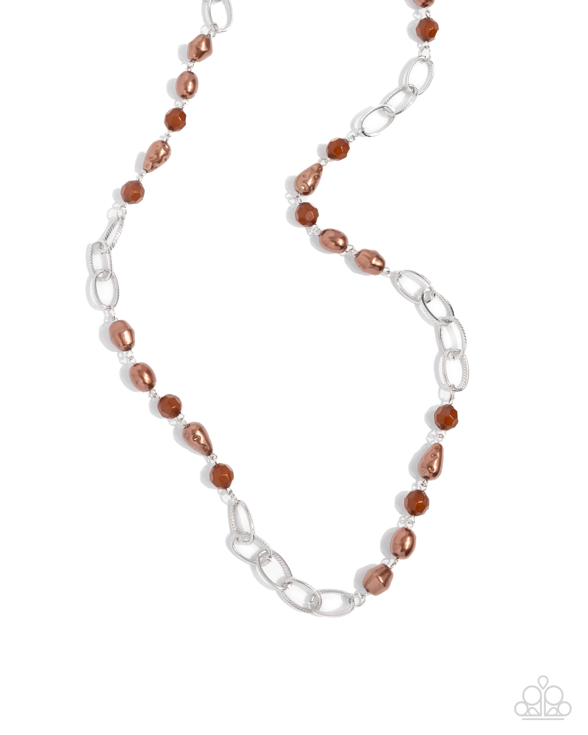 Featuring imperfectly faceted and hammered finishes, pearly brown teardrop and round beads join opaque brown crystal-like accents along sections of chunky silver chain across the chest for a glamorous look. Features an adjustable clasp closure.