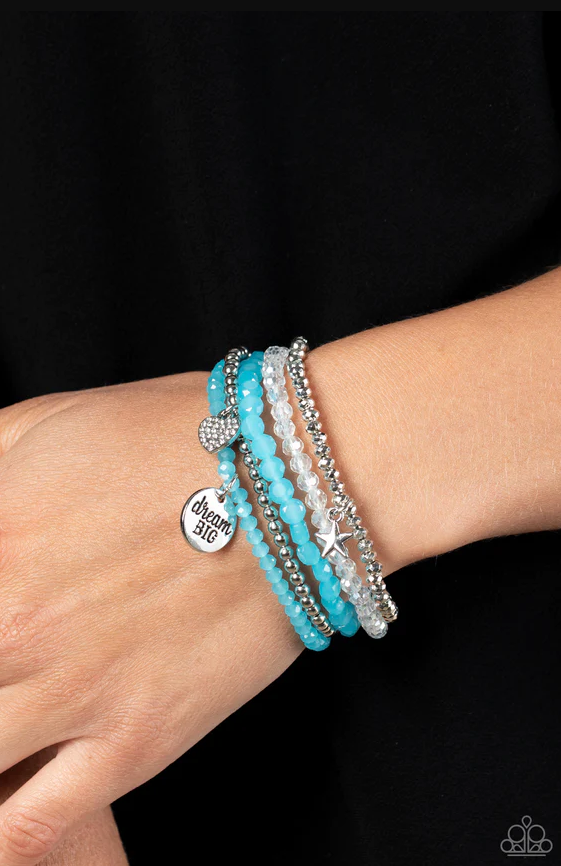 Reflective blue, defaced silver, reflective white, and smooth silver beads wrap around stretchy bands, and combine into a colorful stack along the wrist. The reflective, blue-beaded bracelet features a silver pendant with the phrase "dream BIG" stamped on it, while a defaced, silver-beaded bracelet features a silver star charm. Hanging from smooth, silver beads, a heart charm embossed with white rhinestones adds a shimmery detail to the stack, resulting in a youthful, dreamy design.