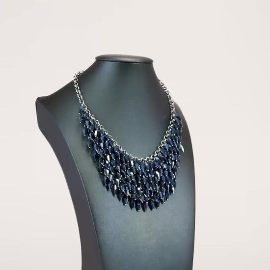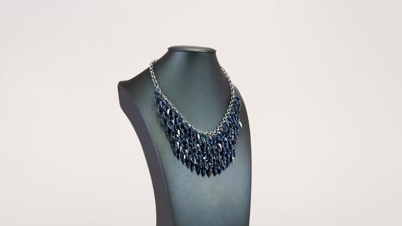 Row after row of metallic blue beads swing from an edgy net of glistening gunmetal links, layering into an edgy fringe below the collar. Featuring flashy faceted edges, the mesmerizing beads spark and sizzle into a conflagration of sparkle below the collar. Features an adjustable clasp closure.