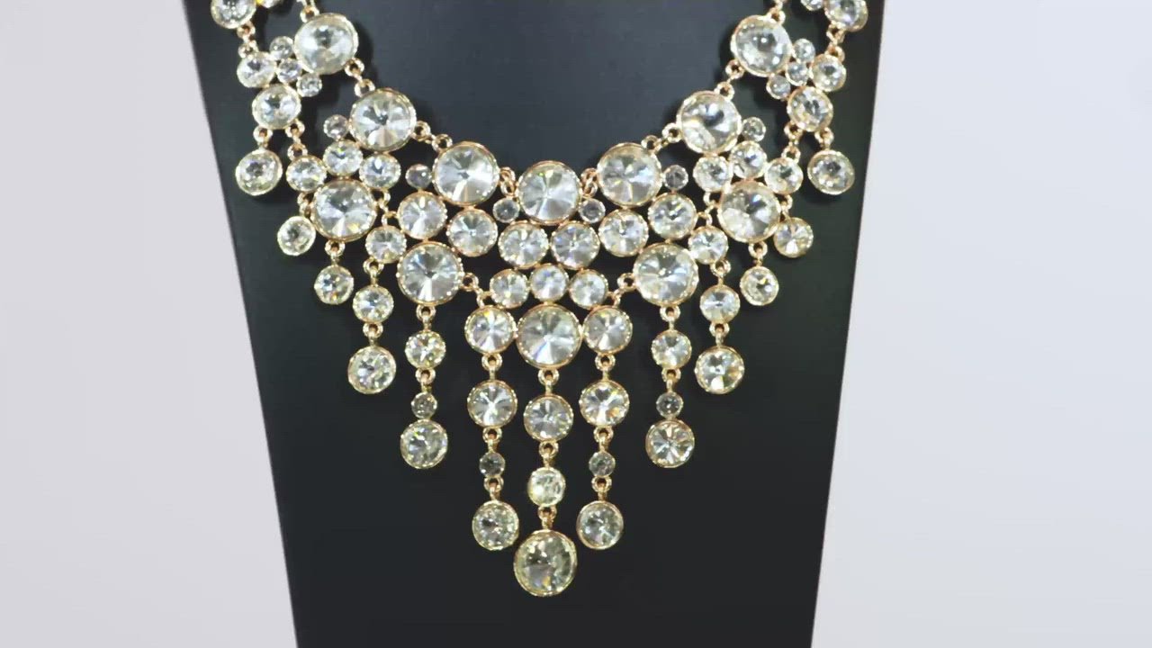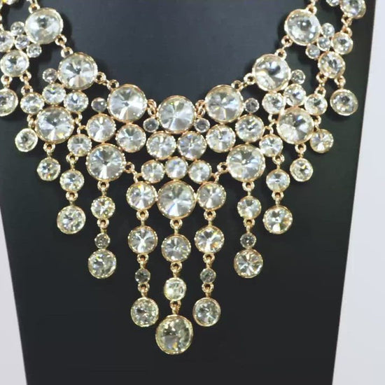 A sparkling storm of classically clustered white rhinestone frames elegantly scatter below the collar. Encased in sleek gold fittings, varied sizes of glassy white rhinestones drip from the bottom of the delicately linked gold frames, resulting in a head-turning twinkle that demands a double take. Features an adjustable clasp closure.