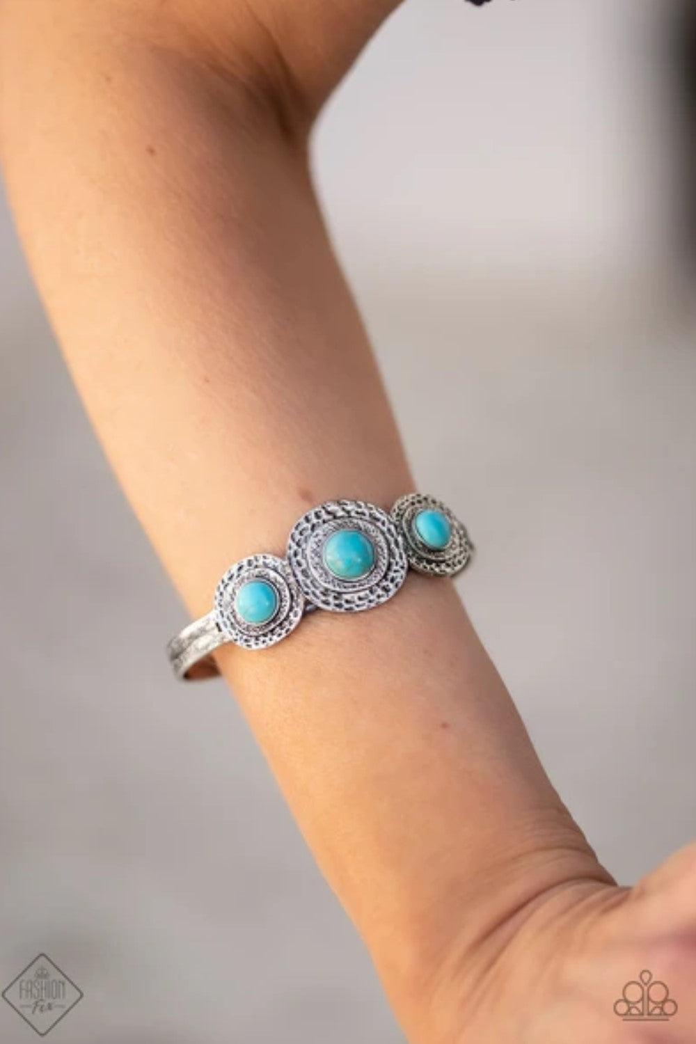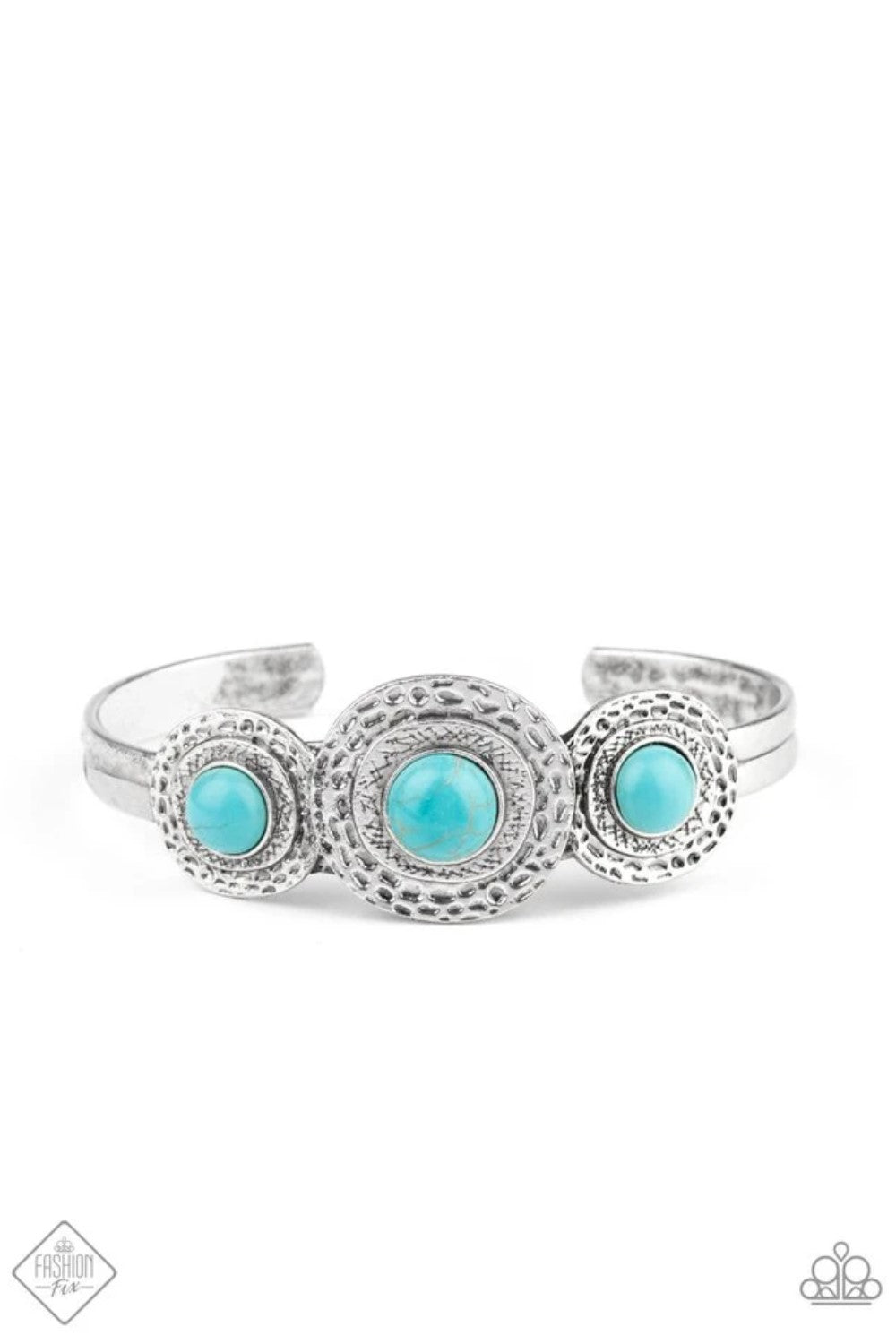 Three round turquoise stones dot the centers of three hammered silver frames, creating a rustic centerpiece atop an antiqued silver cuff.