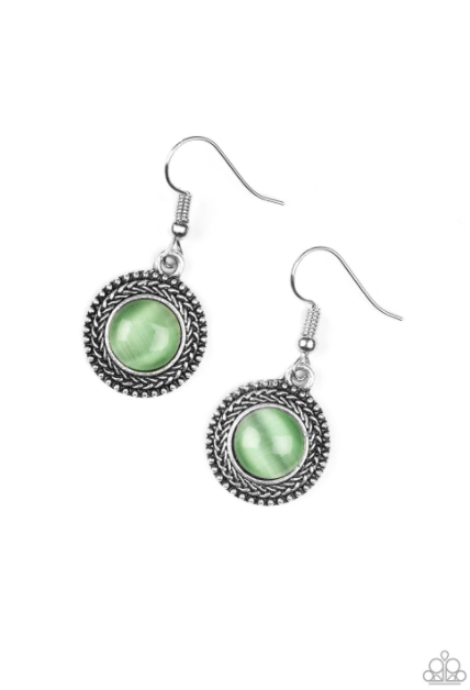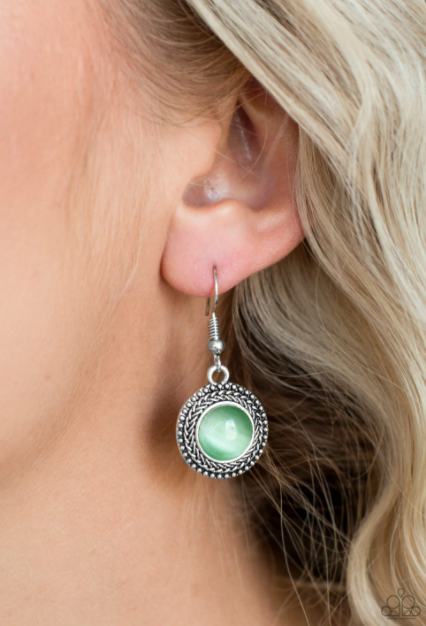 A glowing green moonstone is pressed into the center of a circular silver frame embossed in tactile patterns for a seasonal look. Earring attaches to a standard fishhook fitting.