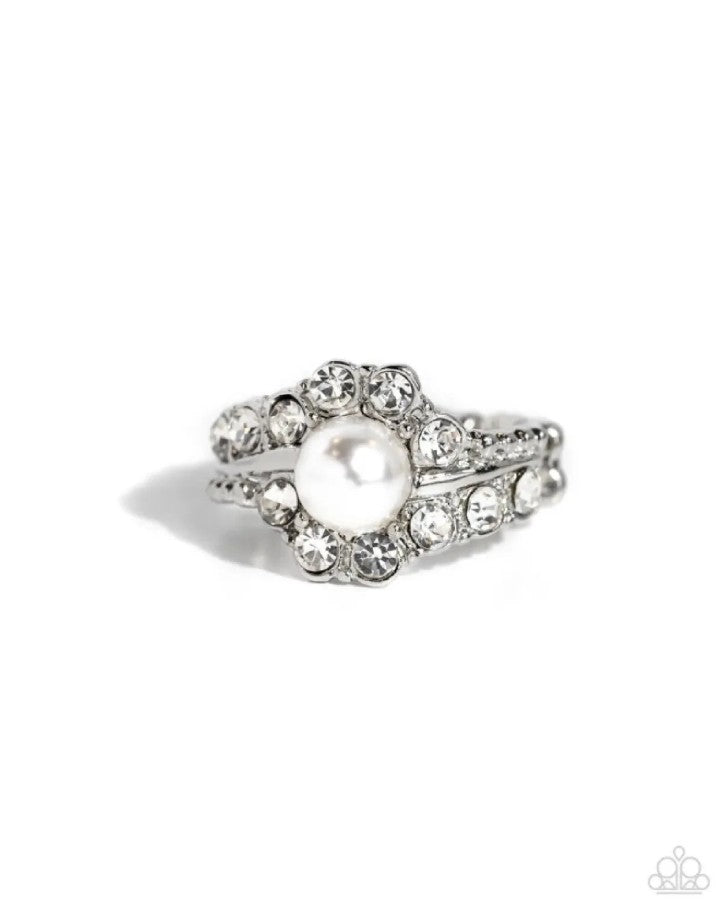 A solitaire white, encircled in brilliant white rhinestones set in layered shiny silver bands, creates a glamorous elegance atop the finger. Features a dainty stretchy band for a flexible fit.